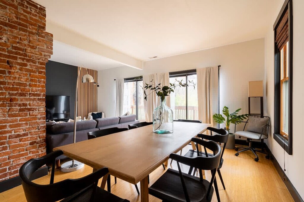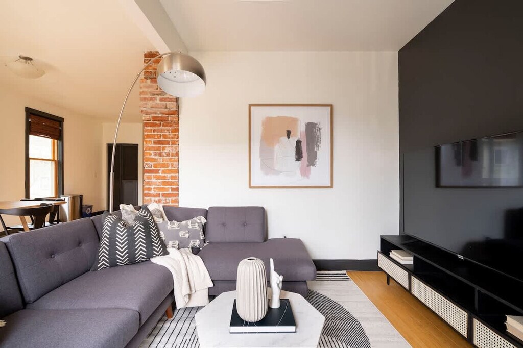 Experience the charm of Portland in this stylish loft located in the beloved Alphabet District, just steps away from NW 23rd Ave and top cafés. This sunny, Scandinavian-inspired 3-bedroom flat features exposed brick, a fully stocked kitchen, fast Wi-Fi, and comfortable queen beds. Situated above a quiet retail space, this second-floor apartment offers a private entrance with stairs leading to the unit, blending historic charm with modern amenities. This airy loft is designed with Scandinavian aesthetics and historic charm, featuring mid-century furnishings, original brick, and abundant natural light. The main level includes an open-plan living room with a Smart TV, a cozy sectional, and sunny windows, a dining table for six, and a fully stocked kitchen with stainless appliances and a Keurig coffee maker. The second floor also hosts a queen bedroom with a closet and a full bathroom with a tub/shower combo. The third floor offers a private queen bedroom with sloped ceilings and soft lighting, and a second queen bed tucked into a spacious open hallway, ideal for early risers or extra guests. Highlights include central heat and A/C, high-speed Wi-Fi, an in-unit washer and dryer, and a private front entrance. Ample street parking is available around the property, and ride-sharing services like Uber and Lyft are widely accessible, providing convenient options for getting around without the hassle of parking. Welcome to the vibrant NW Portland neighborhood, nestled in the trendy Slabtown district. This location offers a perfect blend of historic charm and modern amenities, with top-rated restaurants, cozy cafes, and bustling bars just steps away. Enjoy gourmet meals at local favorites like St. Jack, brunch at Besaw’s, or craft cocktails at Breakside Brewery. Coffee lovers can visit Dragonfly Coffee House or Barista. The area is also home to unique shops and boutiques, perfect for retail therapy. Outdoor enthusiasts will appreciate nearby Wallace Park and the scenic trails of Forest Park, providing a beautiful setting for hiking and nature walks. Whether for business or leisure, the lively atmosphere of NW Portland ensures a memorable stay. The unit is accessed via one flight of stairs with no elevator, and there is a retail tenant on the ground floor who remains quiet during evenings. The third floor includes one private queen bedroom and one open-concept queen bed. Smoking and parties are prohibited, with quiet hours observed after 10pm. The apartment features a Keurig coffee machine, with no drip or French press available. Quiet hours are enforced between 10:00 PM and 8:00 AM. [SI]