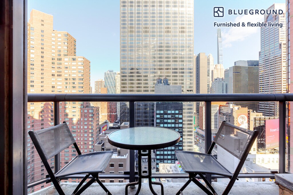 Show up and start living from day one in New York with this sophisticated one bedroom Blueground apartment. You’ll love coming home to this thoughtfully furnished, beautifully designed, and fully equipped Theater District home with stunning balcony views over the city. (ID #NYC1741) The advertised rate of $5,370/month is the lowest available price, based on a 2 month(s) and 22 day(s) stay with a move-in date of March 4, 2026. If you’re looking for a 1-year stay, the rate is $5,940/month. Rates vary depending on the duration of stay, season, and other parameters. For exact pricing and additional pricing components, please visit our website and enter your desired move-in and move-out dates. The rate is applicable when billed upfront; it can be higher if billed in multiple payments. Brokers are welcome to reach out. Were you looking for an unfurnished lease? Try Blueground instead and upgrade from unfurnished to furnished living: - Furnished at rates comparable to unfurnished - No setup or furniture costs - save thousands - Move-in ready - save time, just bring your suitcase Designed with you in mind Gorgeous furniture, fully equipped kitchen, smart TV, and a premium wireless speaker are just a few of the amenities you’ll find inside this one bedroom apartment. Ideally located in New York, you’ll find a lot to love outside as well. When you’re ready to relax, you’ll be happy to discover every Blueground bedroom comes with superior quality mattresses, fully stocked linens, and cozy towels. We handle everything so you can simply show up and start living. Sleeping arrangements Queen Bed, 63in/160cm Amenities Building amenities unique to this one bedroom apartment include an on-site: - Doorman - Dryer in building - Elevator - Washing machine in building - Lounge - Pets allowed Arrival and ongoing support The entire apartment is yours to enjoy! Throughout your stay, you’ll have access to our Client Experience team through the Blueground App. You can schedule additional cleanings, submit maintenance requests, and view our neighborhood recommendations with just a few taps. We’ll share all details upon confirmation of your stay. Other things to note Building amenities may have an extra cost. This Blueground apartment has flexible lease options, allowing you to book it for one month, a year, or more. Pets are welcome, though weight limits and breed restrictions apply and may incur fees. Brokes CYOF. We take great pride in ensuring every photo displayed is shot in our own units with our actual furnishings. That said, we regularly refresh our decor and furniture arrangement, which may differ from what’s pictured. Also note - Other apartments in this building are undergoing renovations, and you may hear construction noise inside your apartment from time to time [SI]