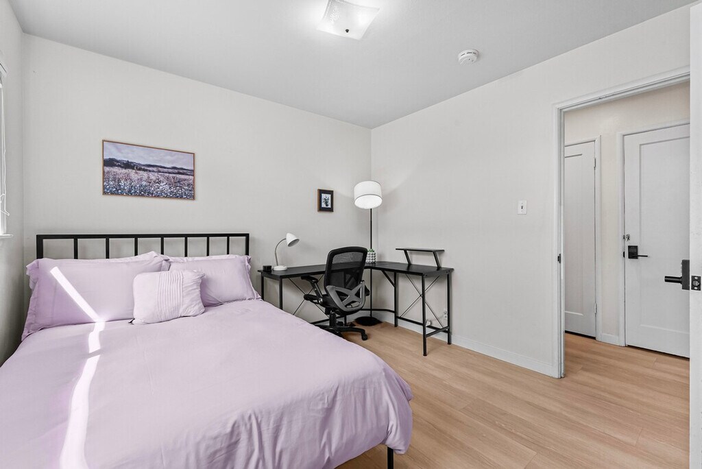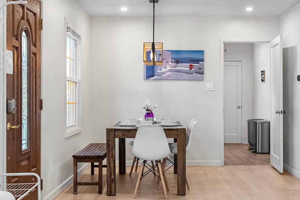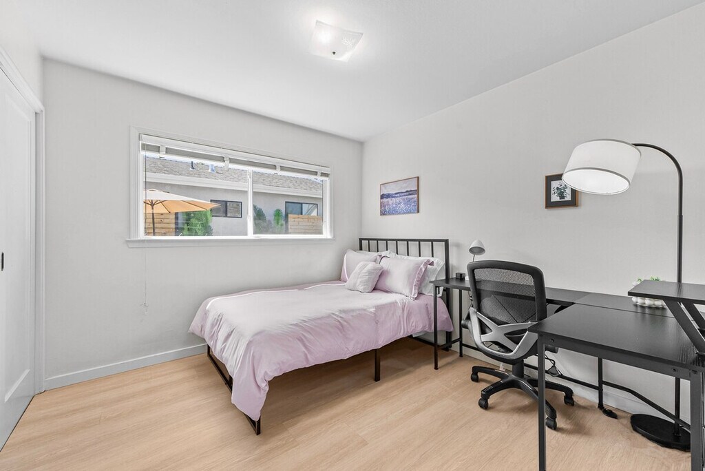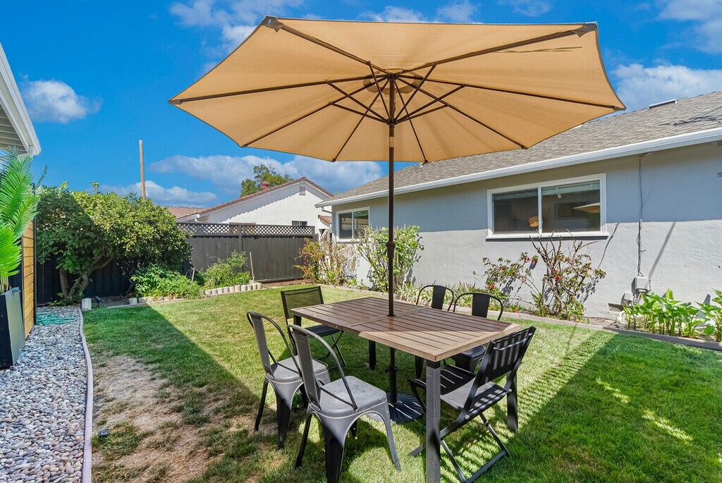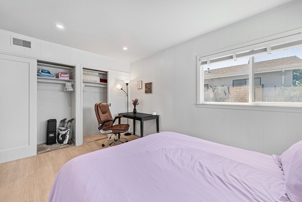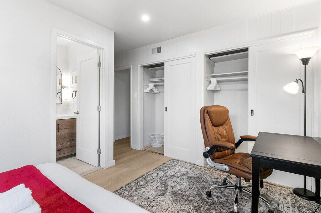 Welcome to this private single-story 3-bedroom, 2-bathroom unit nestled in a safe and convenient single-family neighborhood in the heart of Silicon Valley. Feel at home with a central location just a 15-minute walk to shops and restaurants on El Camino Real, and easy access to major commute routes like San Tomas Exwy, Saratoga Ave, and Homestead Rd. The unit is completely private, though the kitchen shares a wall with another unit. This 3-bedroom unit offers a full kitchen equipped with all necessary cooking utensils, a cozy living room featuring a 49" Samsung TV, a couch, and a dining table. Enjoy high-speed WiFi with unlimited data, central heating and AC, in-unit laundry, and baby essentials including a Pack & Play, high chair, and toys. The master bedroom boasts a queen-sized bed, desk, chair, and an ensuite bathroom with a curbless shower, double sink vanity, and floor heating. The two smaller bedrooms feature a king-sized bed in one and a double-sized bed in the other, each with a desk, chair, and closet. A hallway bathroom includes a bathtub with shower. The property includes curbside parking right in front of the entrance, offering more convenience than driveway parking. There are plenty of parking spaces along the street. Situated in a prime Silicon Valley location, this apartment is just 2.5 miles from the Apple Campus, 10 miles from Google, 3 miles from Intel, and 2 miles from Nvidia. The neighborhood offers plenty of street parking and is within walking distance to El Camino Real, where you'll find shops like Target and Sprouts, and cafes like Peet's Coffee. The unit has a strict no-smoking policy, with a penalty of $500 USD for any traces of smoking inside. Street parking is available for guests. If any issues arise during your stay, they should be addressed immediately as refunds on cleaning or nightly rates will not be authorized after check-out. Each bedroom is equipped with a desk and chair, providing a comfortable space for remote work. High-speed WiFi ensures a seamless work-from-home experience.