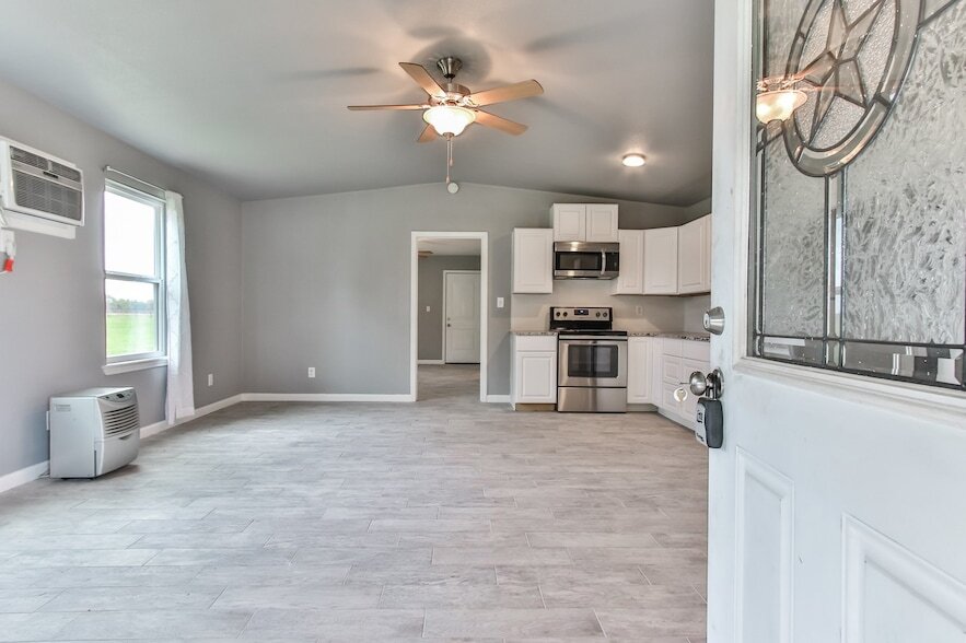 Ideal for tenants with horses, this 5+ acre property offers a peaceful country setting on a scenic corner lot at FM 362 and Mayer Rd with convenient access to Hwy 290 and Hwy 6. The charming 2-bedroom, 1-bath home features a bright open-concept floor plan with wood-look tile flooring throughout no carpet. The updated kitchen includes stainless steel appliances, granite countertops, abundant cabinetry, custom tile backsplash, and an undermount stainless steel farmhouse sink. Large picture windows provide natural light and beautiful views of the surrounding acreage. Neutral tones continue into the spacious bedrooms, including a primary suite with direct access to the covered back patio. The renovated bathroom features an oversized walk-in shower, pedestal sink, updated hardware, and custom shelving. Horses are welcome, making this property a great option for those seeking space and country living.