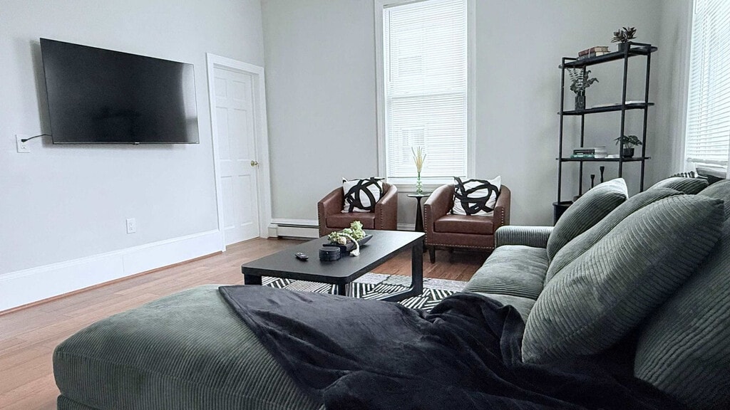 Feel at home in The Green Haven, a fully furnished 3-bedroom, 2-bath apartment in the heart of Taunton, MA. This peaceful, green boho-style space is perfect for individuals looking for comfort and convenience. This apartment offers a fully equipped kitchen with full-size appliances, cookware, and dishes. The living room features a Smart TV, boho decor, and comfortable seating. Stay comfortable in all seasons with A/C and heating. Pets are welcome with a fee of $100 per pet per stay, with a recurring monthly charge for stays longer than 30 days. Coin-operated laundry is available in the basement. Set in a quiet neighborhood, this apartment offers easy access to hospitals, highways, and downtown amenities. Smoking is not allowed. High-speed Wi-Fi is available, great for remote work. Registration Number: C [SI]
