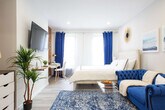 This brand new studio apartment is located on the Upper East Side of Manhattan, in the heart of the neighborhood. The location is ideal for both business and leisure travelers, with many restaurants, bars, shops, and other amenities nearby. The apartment is conveniently located near subway stations, with the Q train only a 2-minute walk away and the 6 train about 5 minutes away. This studio is a brand new and fully renovated apartment that offers a comfortable and luxurious living experience. It features a spacious living room lounge, a cozy bedroom with a queen-size bed and memory foam mattress, a full bathroom, a fully equipped kitchen, and an in-unit washer and dryer. The apartment boasts high-quality renovations, new furniture, ample natural light through two big windows, and complimentary clean linens and towels. Guests will also enjoy the added convenience of complimentary high-speed wireless internet and 120 HD cable channels. This apartment is an ideal choice for those seeking a memorable New York City vacation or a comfortable and convenient stay. Under 15-pound dogs are allowed with owner approval. One pet is allowed with a $350 pet fee. The neighborhood offers a variety of dining and shopping options, with many highly recommended restaurants, bars, and trendy shops nearby, as well as various amenities such as supermarkets, pharmacies, coffee shops, delis, fast food, nail salons, cleaners, and bank services. The area is considered a convenient place with plenty of options. Getting around East 75th Street can be done by several means of transportation, including walking, biking, or taking public transportation such as the subway or bus. The subway has several stations located near East 75th Street, including the 72nd Street subway station on the 1, 2, and 3 lines, the 77th Street subway station on the 6 line, and the 86th Street subway station on the 4, 5, and 6 lines. Additionally, several bus lines also run through the area, making it easy to get around. Taxis, Ubers, and other ride-hailing services are also available, making East 75th Street a well-connected location for transportation. New York City's heating season is until the end of May. Beginning around mid-April, window air conditioning will be installed in the apartment. Contact us if you would like to request an earlier installation. Smoking and parties are not allowed. Please keep quiet and respectful for your neighbors and follow trash recycle rules. [SI]