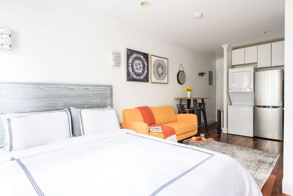 Feel at home in this cozy studio apartment located in the heart of Gramercy Park, New York City. This fully furnished apartment offers a comfortable stay with in-unit washer, dryer, A/C, and heat, ensuring convenience and comfort. Situated close to major areas like Midtown, Downtown, and the Financial District, and with easy access to several subway lines, this location is perfect for exploring the city or attending meetings. This studio apartment is thoughtfully furnished and equipped for a relaxing stay. Sleep soundly on the queen-size bed with soft linens and pillows, and enjoy the convenience of a full kitchen with all necessary appliances and utensils for meal preparation. The apartment includes a washer and dryer for your laundry needs, and air conditioning and heating to adjust the temperature to your preference. For entertainment, watch your favorite shows on the 40" flat-screen TV and stay connected with free Wi-Fi. Additional amenities include an iron, ironing board, and hair dryer for personal grooming. Welcome to Gramercy Park, one of New York City's most desirable and historic neighborhoods. This vibrant and safe area is surrounded by tree-lined streets, elegant architecture, and beautiful parks. Your studio apartment is just steps away from the famous Gramercy Park, a private oasis accessible only to local residents. Explore nearby attractions, including a variety of restaurants, bars, cafes, and shops catering to every taste and budget. With several subway lines nearby, you can easily reach popular destinations like Times Square and the Empire State Building, experiencing the magic of the city that never sleeps. The apartment is located on East 24th Street in the Gramercy Park area, close to several subway lines, including the 23rd Street station serving the 6, N, R, and W trains. The area is well-served by bus routes, taxis, and ride-sharing services like Uber and Lyft, making transportation convenient. New York City's heating season lasts until the end of May, and window air conditioning will be installed around mid-April. Early installation requests are welcome.