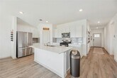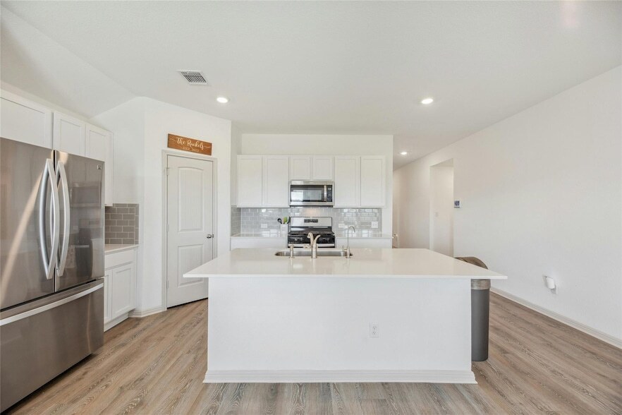 Will be Ready for a March 1st, 2026 Move-In! Absolutely adorable & affordable modern farmhouse style home on a huge .21 ac lot backing to a greenbelt with beautiful views! This home is cozy & welcoming! From the minute you walk up you are greeted by a cute front sitting porch & the foyer leads to a nice open floorplan with lots of big picture windows that bring in tons of natural light making this a bright & happy home! You will love that the whole home has tall coffered ceilings & gorgeous wood Metro flooring throughout (NO CARPET! YAY!). The gourmet kitchen is any chef's dream with a big center island, Quartz counters & classic subway backsplash, Stainless Steel appliances with a 5-burner gas stove, deep farm sink & WIP! The oversized primary bedrm has a spa-like bath with double vanities, big WIC, walk-in shower with subway tile surround & custom chrome fixtures! Some of the other great features include brushed nickel ceiling fans, recessed can lights, 2" wood blinds with custom matte black rods & curtains & gorgeous views from all the windows across the back of the home! The oversized backyard features a covered patio & separate BBQ deck that looks out over the Greenbelt section and is perfect for entertaining friends & family! Because of the size of this lot, there is a lot of room between the neighbors, so you will get to experience the privacy and peacefulness of the extra space! This location is amazing and within a 5 min drive to the Historic Downtown District, where they have outdoor movies, games, areas to bike ride & amazing food like Southside BBQ & Market as well as tons of other yummy restaurants! Just 10 min to the new Samsung Plant & convenient to the toll roads for a short commute to the new Apple Campus, Dell Computers, Costco, Star Ranch Golf Course & more! What an amazing place to live! Stainless steel fridge & washer dryer convey as well!