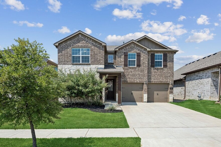 This beautifully upgraded 5-bedroom, 3-bath home in Pecan Square offers an ideal layout for comfortable living and entertaining. Enjoy the convenience of a downstairs primary suite and a guest bedroom (can easily flex as private office) with access to a full bath perfect for multigenerational living or hosting visitors. Upstairs, you'll find three additional bedrooms, a spacious game room, and a dedicated media room giving everyone their own space to relax, work, or play. Disclover elegant upgrades throughout, including premium flooring, new interior paint, high-end countertops, custom cabinetry, and detailed trim work. The chef s kitchen is the heart of the home, featuring a large island, ample storage, and modern finishes that flow seamlessly into the living and dining areas.The primary suite offers a spa-like retreat with a soaking tub, separate shower, dual vanities, and a walk-in closet. The backyard is built for easy maintenance and outdoor enjoyment, complete with pet-friendly turf and a covered patio great for grilling or relaxing evenings under the stars. Additional highlights include designer paint, upgraded fixtures, and washer, dryer, refrigerator included. Located in award-winning Northwest ISD. Pecan Square offers unmatched amenities, including a resort-style pool, massive clubhouse, sports area, pickleball courts, parks, dog park, coffee house, co-working space, fitness center, and more. Off-the-charts amenities for all!