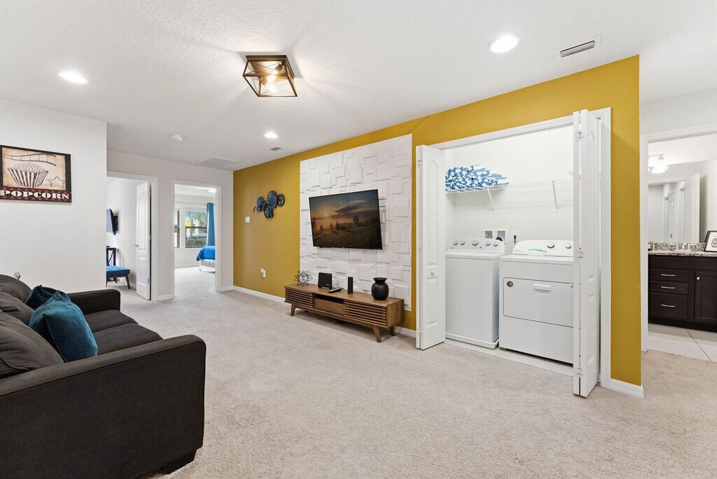Feel at home in this modern 5-bedroom villa at Windsor at Westside Resort, accommodating up to 14 guests. It's perfect for a memorable family or group getaway! This beautifully designed villa features a stylish living room, a fully equipped kitchen, and a generous dining area. The kitchen is stocked with all the essentials to prepare meals with ease. There is also a cozy family lounge upstairs, offering additional space to unwind, play, or watch a movie. Enjoy thoughtful touches like free Wi-Fi and an in-home laundry area with a washer and dryer. A welcome kit with basic bathroom and kitchen essentials is provided to get you started. Pool heating and BBQ grill use are available for an additional fee. Located in the heart of Kissimmee, Florida, Windsor Westside Resort offers an array of amenities and activities. Nestled minutes away from Walt Disney World and other world-renowned attractions, Windsor Westside provides the perfect home base for your Orlando adventure. Explore the theme parks of Disney, Universal Studios, and SeaWorld, or indulge in shopping sprees at nearby outlets and malls. Championship golf courses, scenic nature trails, and exciting dining and entertainment options are also just moments away. Quiet hours are observed between 10 PM and 8 AM. Guests are responsible for replenishing bathroom and kitchen essentials as needed. [SI]
