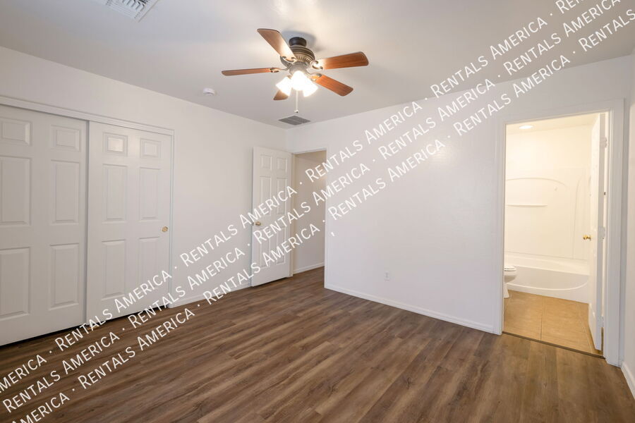 Stop the car! This home is a must see. Spacious great room floor plan. Brand new vinyl wood flooring in the family room and bedrooms. New bathroom sinks and fixtures. Eat in Kitchen features a pantry, black appliances and lots of cabinet space. Windows all have exterior sun shades to cut down the sun and the heat. Easy to maintain landscape! Owner will be installing Artificial turf in the backyard area, just around the patio area once the property is leased! Home is located just steps away from the community pool! *App fee is $55 per adult. One Time Admin Fee: $300, Pet Deposit: $300/pet (if applicable), Service Fee 2%. Residential Benefit Package $39/month. Helping Heroes Discount Available. Ceramic Tile Community Pool Disposal Dryer Garage Pets Allowed Washer