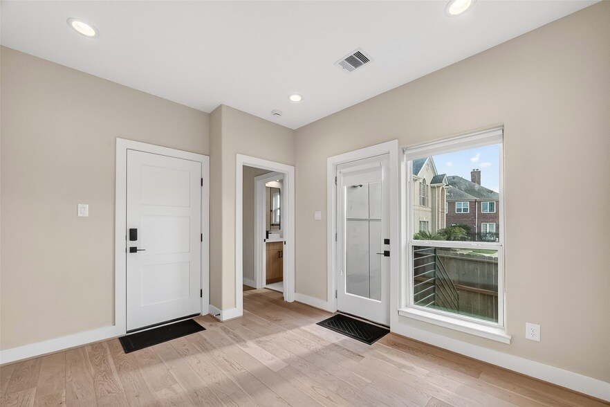 This modern 3-bedroom, 3.5-bath residence features a thoughtfully designed layout with high ceilings and natural-tone wood flooring throughout. The open floor plan creates a seamless flow between living spaces, while each bedroom includes its own attached bath for added privacy and convenience. The main level offers a versatile home office, along with a private bedroom and en suite bath. Upstairs, the open kitchen and living area serve as the heart of the home. The kitchen is finished with abundant cabinetry, warm natural wood tones, stainless steel appliances, and an oversized island with a built-in sink. The kitchen opens directly to the living area, which extends to a private balcony. The third floor features two additional bedrooms, including a spacious primary suite. A fenced backyard provides additional outdoor space. Ideally located near Houston s Medical Center and the Museum District, this home offers convenient access to major roadways.