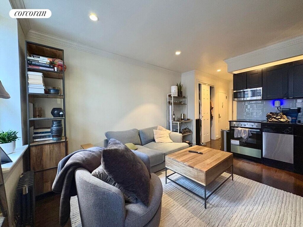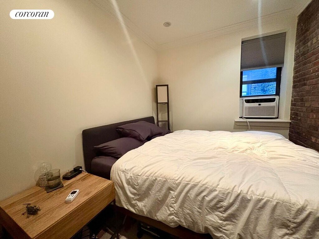 Tenant Occupied Advance Notice Required for Access. Renovated one bedroom, one bathroom apartment located in prime Chelsea. This apartment exudes charm, featuring crown molding, dark stained hardwood floors throughout and exposed brick in both living room and bedroom. The open kitchen features dark cabinetry and stainless steel appliances including dishwasher and microwave. The bedroom fits a queen sized bed, dresser and nightstands but does not have a closet. Washer/Dryer in unit.The apartment has been equipped with video intercom and through the wall A/C installed. Situated on the 4th floor of a small well kept prewar walk-up building with laundry in unit as well as the building. Easy access to the A,C,E,1,2,3,L and Path trains around the corner and just minutes from Union Square, West village and the Meat packing district makes this location truly unbeatable. Pets allowed.