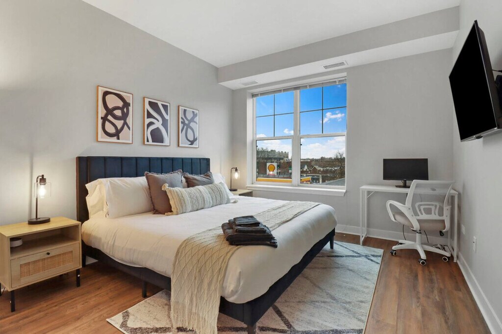 The advertised rate of $5,166/month is the lowest available price, based on a 1 month(s) stay with a move-in date of April 18, 2026. Rates vary depending on the duration of stay, season, and other parameters. For exact pricing and additional pricing components, please visit our website and enter your desired move-in and move-out dates. The rate is applicable when billed upfront; it can be higher if billed in multiple payments. Feel at home in this professionally managed 2-bedroom, 2-bath apartment in downtown Elmhurst, providing the perfect balance of luxury and comfort for business travelers and families. Designed to serve a short getaway or a longer business trip, this apartment is fully stocked with items and amenities to cater to business travelers, couples, and small families with children. Enjoy the fully stocked kitchen with a coffee station, stainless steel appliances, and cooking supplies to enjoy a homecooked meal. Additional amenities include in-unit laundry, outdoor BBQ grills, and a community lounge. The apartment community features resort-like amenities including a state-of-the-art fitness center, movie theater, private patio overlooking the city, lounge with a pool table and shuffleboard, and well-lit outdoor firepits and dining area. Reserved parking is available in a heated garage. Located in downtown Elmhurst, this apartment is a block from numerous highly rated restaurants, coffee shops, and nightlife, and a few blocks from the Metra train station with easy access to downtown Chicago. It's also situated near plenty of suburban Chicago gems, nearby classy Oakbrook (8 mins), and O'Hare airport (12 mins). Strict adherence to the policies is required, including no parties, smoking (of any kind), or community disturbance. No unauthorized guests are allowed, and violators will be subject to a $500+ fine. Quiet hours are from 10:00 PM to 7:00 AM — please be mindful of neighbors and community guidelines. Furniture must remain in its original placement; rearranging is not allowed. Respect check-in and check-out times — early check-in or late check-out requires prior approval and comes with a small charge of $45. Pets are not allowed. Upon booking, you may be asked to present a valid ID for verification. Dedicated workspaces are available in each bedroom with monitors, surge protectors, and high-speed Wi-Fi. [SI]
