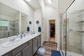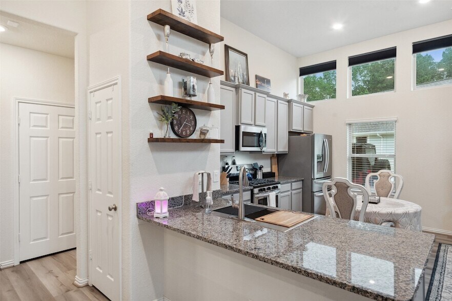 Located in the master-planned community of Woodforest, this beautifully updated one-story home offers stylish living on a quiet cul-de-sac. A wide front porch creates a welcoming first impression, while inside, soaring ceilings, tall windows, and new automated blinds fill the home with light. The kitchen features granite countertops, stainless steel appliances, an updated sink and faucet, painted cabinetry, and an island with bar seating. The open layout connects living and dining areas, perfect for everyday comfort or entertaining. The primary suite includes a vaulted ceiling, dual vanity, glass-enclosed shower, & walk-in closet. Two secondary bedrooms & a full bath sit opposite the primary. Recent updates include gutters, new flooring, a built-in safe & a whole-home water system. Enjoy one of the largest backyards in the section, fully fenced for pets and play. A Generac generator offers peace of mind. Woodforest offers high-tier amenities, community events, and convenient shopping.