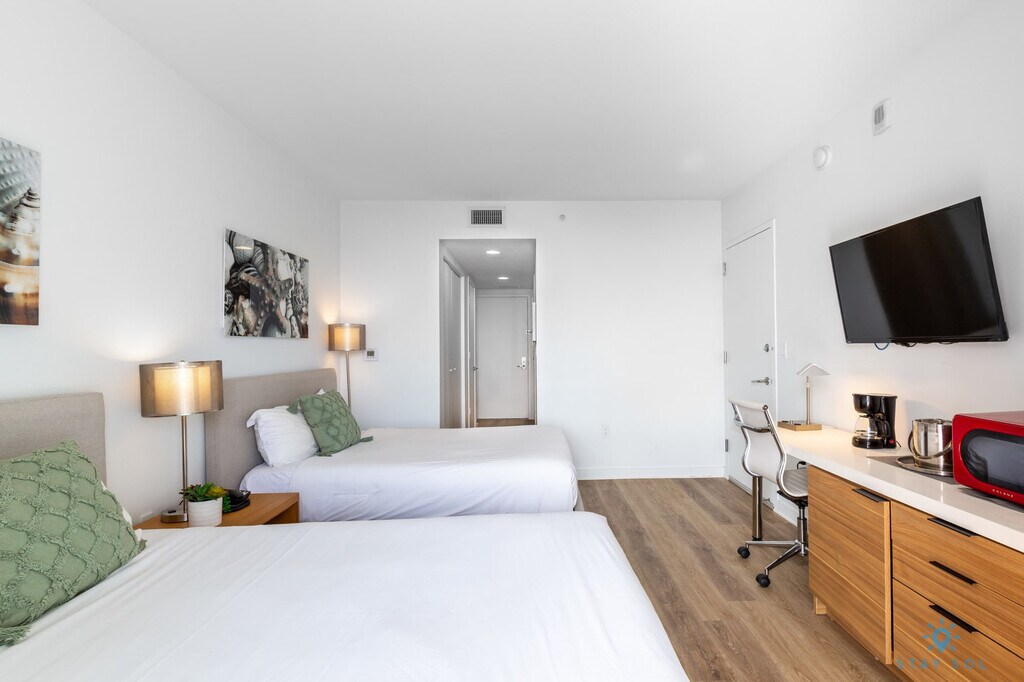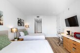 Experience the spectacular Upper Apartment at Beachwalk Resort, designed by Pininfarina, offering private and stunning views. This spacious studio includes one full bath and two double beds, featuring a balcony with breathtaking views of the Atlantic Ocean, Intracoastal, and Downtown skyline. Feel at home in this beautifully crafted space. The studio offers a convenient kitchenette equipped with a mini fridge, microwave, coffee maker, electric kettle, and toaster, ideal for preparing light meals and snacks. Enjoy the resort-style amenities, including a pool, fitness center, and restaurant. Wireless internet is included, ensuring you stay connected during your visit. Valet parking is available at varying rates depending on the length of stay, and package handling is offered at $5 per package plus applicable taxes. A Pack 'N Play Crib is available upon request. Beach access includes a free shuttle service to the beach, just three minutes away. Located at the corner of Hallandale Beach Boulevard and the Intracoastal Waterway, this condo-hotel is equidistant from Miami Beach and Ft. Lauderdale. Just one block from the beach, it provides easy access to the Hollywood Beach boardwalk, Gulfstream Park, Hard Rock Guitar Hotel & Casino, Aventura Mall, and the vibrant nightlife of South Beach. With a 24-hour Walmart next door and a Publix Supermarket two minutes away, convenience is at your doorstep. Fort Lauderdale Airport is just minutes away, making travel a breeze. Due to ongoing improvements, the gym will remain closed until further notice. The resort imposes additional mandatory fees collected separately at check-in, required to complete your reservation. A $500 fine will be applied for smoking violations. Quiet hours are from 10:00 PM to 07:00 AM, and excessive noise or property damage may result in penalties. Swimming is at your own risk, with no lifeguard on duty, and children must be supervised by a responsible adult at all times. Please keep all doors closed and the air conditioning on to prevent condensation and property damage. [SI]