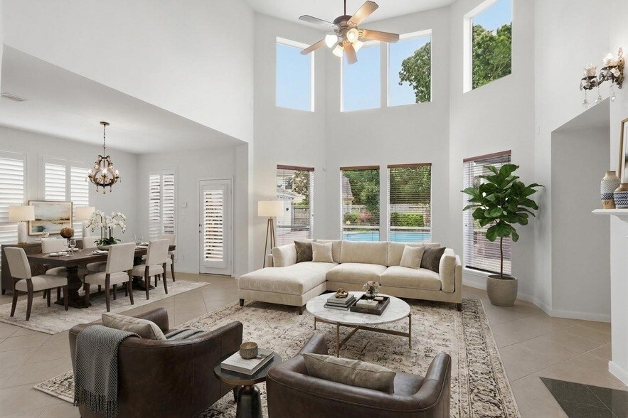 Beautiful Perry-built home in Cinco Ranch on an oversized cul-de-sac lot with a sparkling pool and covered outdoor area. Features a grand two-story foyer with wrought iron front door and tile flooring on the diagonal. Private study with French doors and plantation shutters. Formal dining room with hardwood floors and archways. Spacious island kitchen with granite countertops, tile backsplash with granite inlay, 42" cabinets, stainless steel appliances, and breakfast area. Impressive two-story den with bay window, built-ins, surround sound, and gas fireplace with granite surround. Primary suite with bay window. Upstairs offers a large game room and spacious secondary bedrooms with walk-in closets. Additional highlights include plantation shutters throughout, zoned A/C and heat, sprinkler system, and washer, dryer, and fridge included. Zoned to Katy ISD.