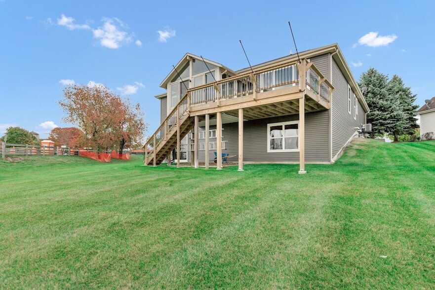 Enjoy nature and comfort in this beautifully updated 3-bedroom, 2-bath ranch home overlooking a peaceful retention pond and scenic 43-acre walking path. With over 2,140 sq ft of living space, this spacious layout features an expansive great room-perfect for entertaining and everyday living. The kitchen shines with new granite countertops, repainted cabinets, and KitchenAid stainless steel appliances (1 year old). A breakfast bar connects the kitchen to the great room, making it ideal for gatherings. The oak hardwood floors throughout the kitchen, great room, den, and foyer have been recently refinished, adding warmth and elegance. The primary suite offers a jetted soaking tub and walk-in closet, while the second bathroom was updated five years ago. Both bathrooms feature granite countertops, and nearly the entire interior (excluding the primary bedroom) has been freshly repainted. This home also boasts a walk-out basement-a blank canvas with plumbing already roughed in for a future bathroom. Major updates include new siding, freshly painted exterior trim, refinished landscaping, a painted garage with new shelving, and a new exterior deck and back stairway. The furnace and water heater were replaced five years ago, and a water filtration system has been installed. The washer and dryer are also just one year old. Enjoy the four-seasons room year-round or step outside to Ted Spella Community Park, located right in your backyard. Close to the public library and the shops and restaurants along Randall Road, this home in the Grand Reserve 55+ Community offers both tranquility and convenience. Move-in ready and beautifully maintained - schedule your showing today!