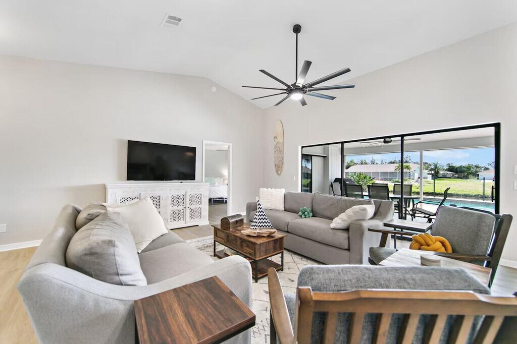 Escape to this peaceful waterfront home, offering over 2,100 sq. ft. of beautifully designed living space. Feel at home in this 3-bedroom, 3-bath retreat, perfect for families seeking a comfortable and fun Florida getaway. This serene retreat features a private heated pool, a fully equipped gourmet kitchen with high-end appliances, a coffee maker, an ice maker, a toaster, cookware, and dinnerware. The sun-filled open layout includes plush seating, a smart TV, and serene canal views. There is a seamless flow to the pool lanai for effortless indoor–outdoor living. The home also features a fenced yard and lush surroundings for privacy and easy relaxation. This is a pet-friendly property for one small dog (up to 20 lbs), with a pet fee to ensure extra cleaning and maintenance. Pool heating is available upon request and must be requested at least 2 days prior to arrival. Enjoy canal views, sunny pool days, and nearby beaches, golf, dining, and parks in Rotonda West. As a waterfront property, occasional wildlife such as birds or small critters may be seen around the canal area. Some outdoor surfaces may become slippery when wet—please take care around the pool and patio. Minor wear may be present on some furnishings due to regular use, though everything is maintained to keep your stay comfortable. Rotonda West is a peaceful residential neighborhood, and no parties or events are permitted. The home does not currently have a carbon monoxide detector, and guests may bring a portable unit if desired. Includes a dedicated office with a desk and chair, ideal for remote work or quiet reading. The office also features a queen pull-out sofa for additional sleeping options. Kindly note there is a required security deposit for this unit. The partner will reach out to you to collect it and handle it offline upon your reservation [SI]