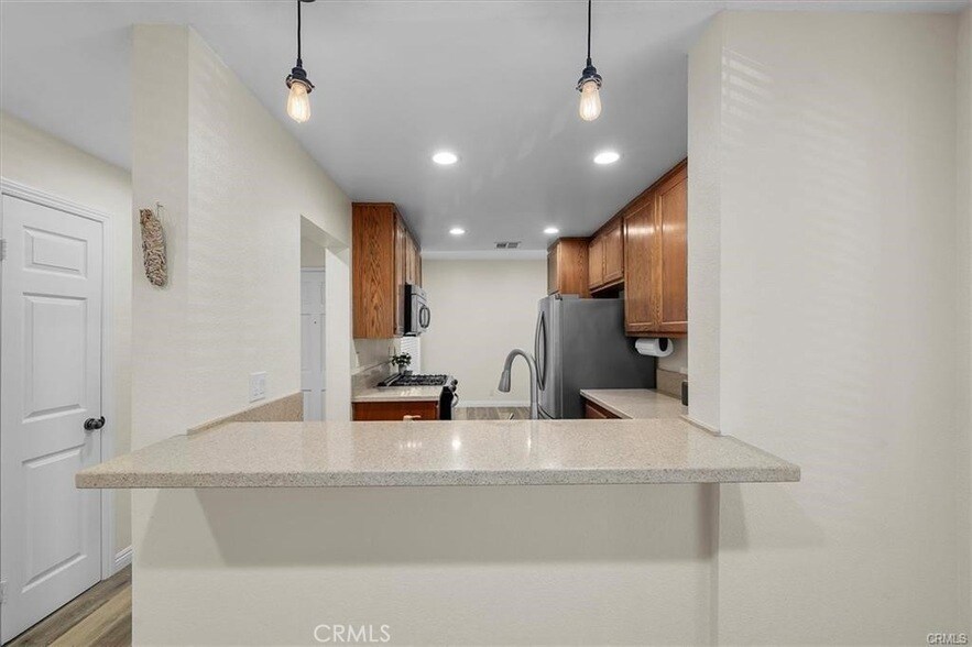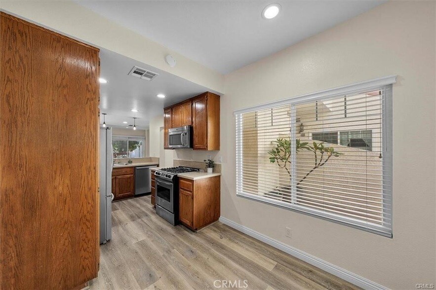 Available for lease now: Beautiful Torrance townhome in small, gated community. This western-facing is end-unit has plenty of natural light in a space configured for convenient living and privacy. Kitchen and baths have been recently updated to contemporary style and flooring is luxury vinyl throughout. Kitchen is fully appointed with applicances and there's a dedicated dining nook adjacent. Living area features recessed lighting, gas fireplace, and opens to a large, private balcony shaded by mature pine trees. Convenient guest bath/powder room on the entry level. Upstairs is laundry closet with stackable washer & dryer, full bath in hallway and the two bedrooms. Primary suite is large and light with generous closet, well-lit alcove and bath with walk-in shower. Second bedroom is spacious and light. Side-by-side 2-car parking in a private garage with gated, security entry. The Gramercy Gardens community has pool and spa for residents. Located on quiet, residential side-street, move-in ready townhome is near the historic Old Town Torrance business district, within walking distance of Torrance and Wilson Parks, and offers easy access to 110 & 405 freeways.