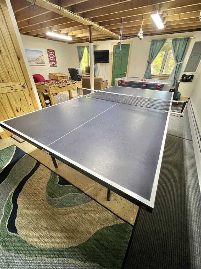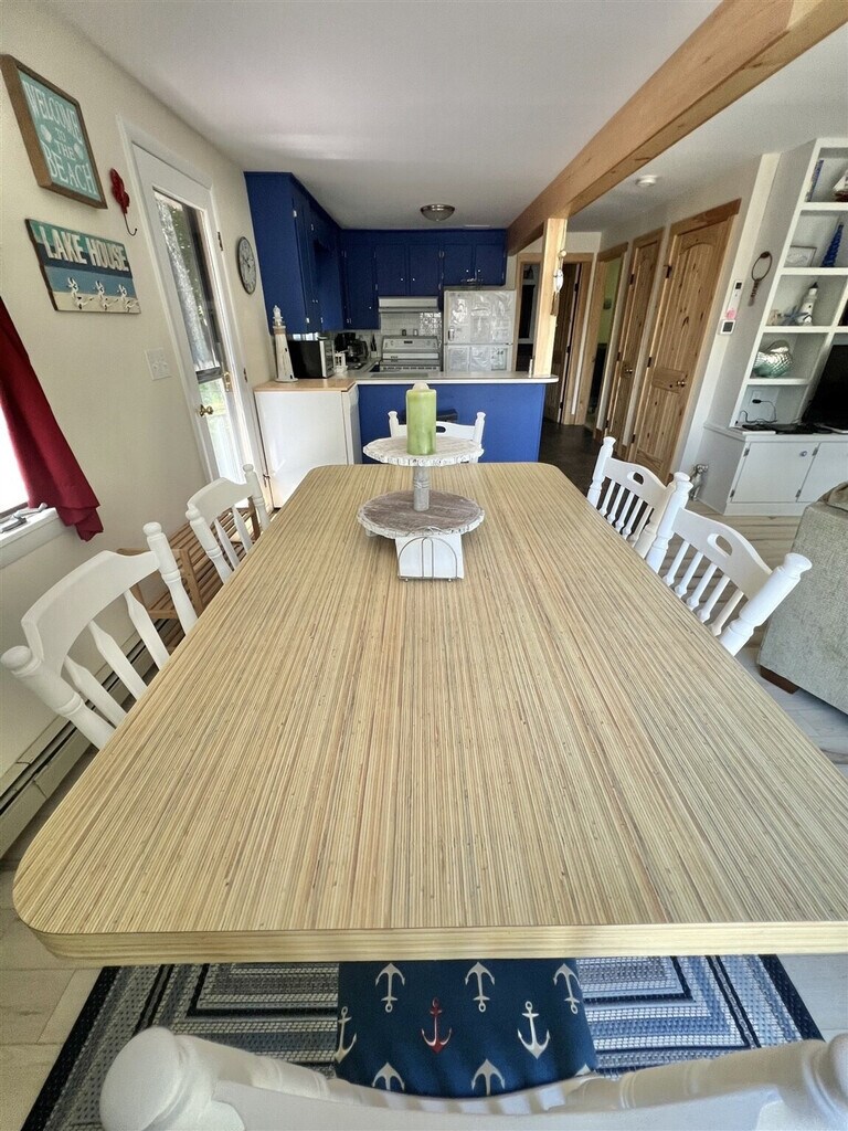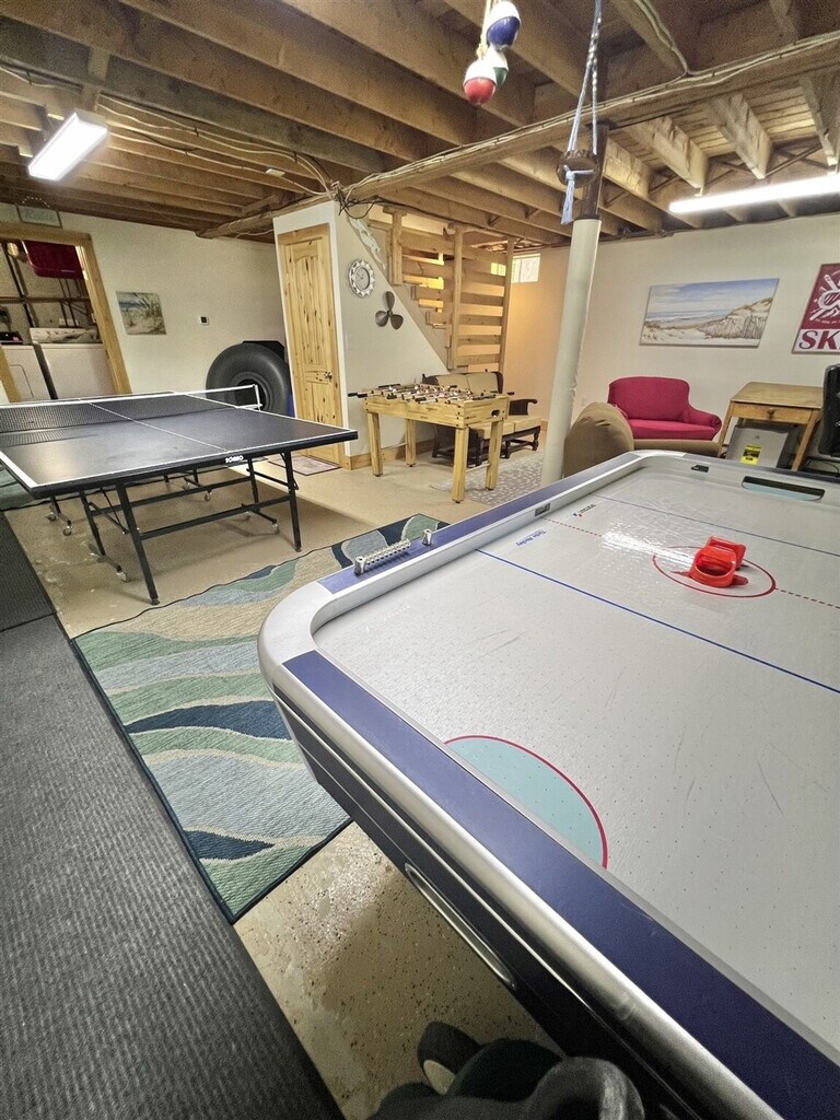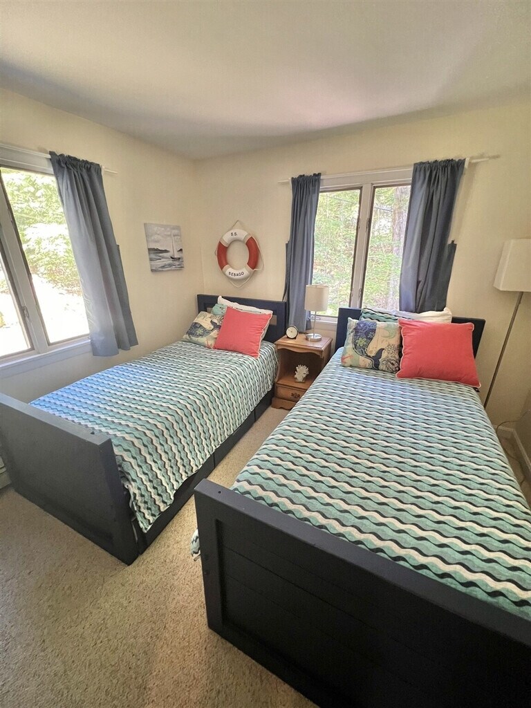 Feel at home in this charming three-bedroom, two-bath gambrel-style home located on the west shore of Sebago Lake in North Sebago. With a spacious open living, kitchen, and dining area leading to a large deck, this home offers a perfect blend of comfort and style. The main floor features a bedroom, while two additional bedrooms are located on the second floor. The walkout basement is equipped with a ping pong table, foosball, and TV for entertainment. Enjoy a private, gently sloping lot just a short walk from a beautiful 120-foot sandy association beach and dock. The beach features a roped-off swimming area for children and a swim float for diving and sunbathing. The property includes a dinghy, two paddle boards, and two single kayaks for your enjoyment, though tenants must provide their own life jackets. Internet access and a DVD player that allows access to personal Netflix accounts are also available. Linens and towels are not provided but are available to rent at our office. The home is equipped with portable fans, heat pumps for AC, oil heating, a gas grill, and a fire pit at the association beach. Outdoor furniture, including chairs and tables, is available at the beach. This home is ideally located near golfing and various area activities, making it a great spot for outdoor enthusiasts. The association beach offers a nice patio and picnic area, perfect for relaxing by the water. The dock is available for loading and unloading, and a mooring is provided for your convenience. The property has an occupancy limit of eight and does not allow pets. Smoking is prohibited. Water is sourced from a well, and the coffee maker is a drip type. [SI]