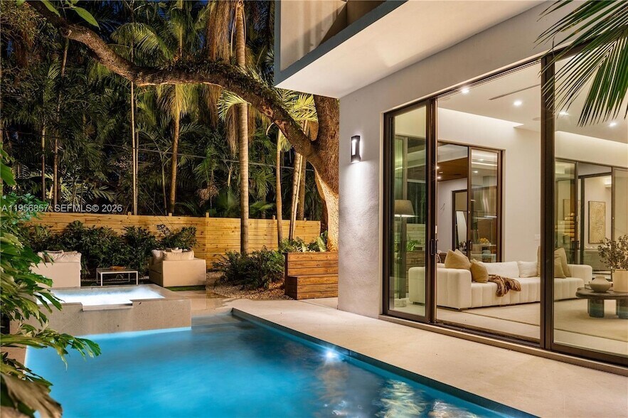Northeast Coconut Grove is prized for its lush, tree-canopy streets, bayside parks and marinas, and a true village lifestyle close to CocoWalk, celebrated dining, boutique shopping, weekend markets, and top-rated schools, with easy access to Metrorail and Downtown/Brickell. Stunning newer-construction 5-bedroom, 5.5-bath home that blends clean modern design with seamless indoor/outdoor living. Bright, open interiors with expansive sliding glass, designer finishes, and an entertainer s chef s kitchen with premium appliances and an oversized island. Elevator, ample storage, and a 2-car garage add everyday convenience. The backyard is a private tropical retreat under a majestic oak, featuring a narrow rectangular plunge/lap-style pool with an attached raised square spa and spillover water feature at the far end, plus a summer kitchen for effortless al fresco dining and entertaining. New furnishing is being updated by 02/13.