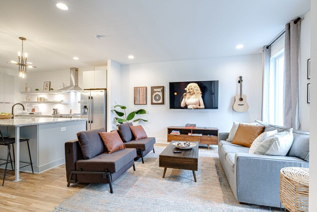 Feel at home in The Blue Bird, your ultimate Nashville retreat. This spacious 4-level home features 4 bedrooms and 4 bathrooms, offering ample space for the entire crew. This entire residence boasts 14 beds, including a king, queens, twins, and convertible couch beds, ensuring everyone has a cozy place to rest. Entertain guests with a top-floor wet bar and a modern, fully stocked kitchen. Smart TVs are placed throughout, including 65” and 55” 4K screens. Enjoy two rooftop decks showcasing skyline views, a private karaoke room, and a game lounge. Includes state-of-the-art appliances, high-speed internet, a large open concept living area, outdoor dining, outdoor lounge space, live TV with all sports channels, TVs in almost every bedroom, towels and linens, an iron and board, a washer/dryer, detergent, and a coffee machine. One-car garage parking is available, but you may need to move game equipment aside. Plenty of free street parking is also available. Situated just 2 miles from downtown Nashville, this apartment places you right by the city’s premier attractions. Discover nearby hotspots such as Hillsboro Village, Music Row, and The Gulch, or indulge in local favorites like the Loveless Café. Experience the vibrant culture, shopping, and dining that define Music City. Getting around is a breeze with a short rideshare ride from anywhere in Nashville. Smoking is not allowed inside the property or near open doors or windows, and a minimum $500 fine applies for violations. Quiet hours are from 10 pm–8 am on weekdays and 12 am–8 am on weekends. If the listing indicates that pets are not allowed, no pets of any kind are permitted. Any undisclosed or unauthorized pet will result in eviction, forfeiture of all rent, and a $150 penalty per pet. If the listing indicates pets are allowed, pets must be disclosed and approved in advance, and a $150 pet fee applies per approved pet. Registration Number: [SI]