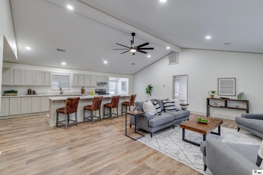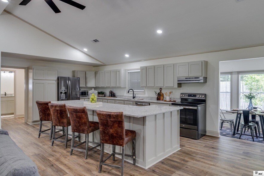 Owner financing terms available! In the Choudrant school district, set on just over 5 acres, this beautifully renovated home welcomes you with a covered front porch and charming gazebo in the yard. Step inside to soaring ceilings, a neutral color palette, and no flooring throughout for a clean, modern feel. The spacious living room is filled with natural light and opens to an impressive kitchen featuring new granite countertops, abundant cabinet storage, and a massive island that doubles as barstool seating. A designated dining room with large windows is perfect for gatherings. The primary suite is a true retreat with a huge walk-in closet with built-ins and a luxurious en suite bathroom offering double granite vanities, tile flooring, a freestanding soaking tub, and a separate tiled shower. Additional spaces include a guest bedroom, a recently updated full bathroom with granite and a tiled tub/shower combo, and a versatile flex room ideal for an office. The oversized utility room connects directly to the backyard. Outdoor features include extra storage space, a back porch, and a freestanding covered unit that can serve as a carport.
