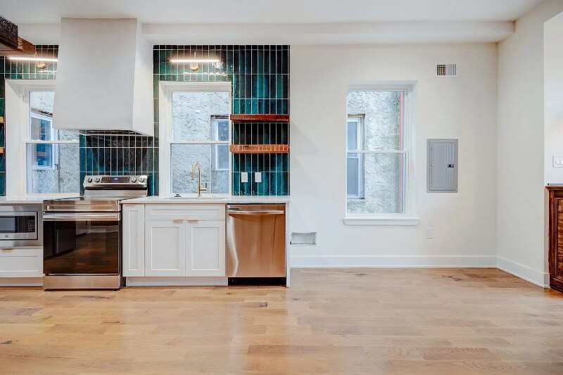 Property Id: 2161183 This stunning Philadelphia apartment blends historic charm with modern upgrades, creating a space that feels both stylish and inviting. Featuring exposed brick walls, hardwood floors, and oversized windows that flood the rooms with natural light, the home offers a warm and welcoming atmosphere perfect for city living. The open living area is highlighted by a contemporary built-in fireplace, a skylight, and sleek lighting fixtures that bring out the character of the space. Neutral tones paired with the texture of brick create a cozy yet sophisticated feel, ideal for relaxing or entertaining. The kitchen stands out with bold designer tilework, open wood shelving, and high-end stainless steel appliances including a refrigerator, freezer, oven, microwave, and dishwasher. With its elegant finishes and spacious countertops, it's both functional and a showpiece for the home. Schedule your Tour today!