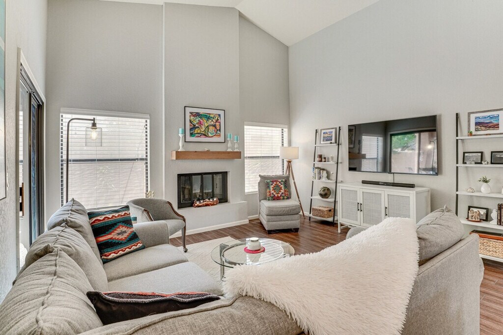 The advertised rate of $4,657/month is the lowest available price, based on a 30 day(s) stay with a move-in date of August 28, 2026. Rates vary depending on the duration of stay, season, and other parameters. For exact pricing and additional pricing components, please visit our website and enter your desired move-in and move-out dates. The rate is applicable when billed upfront; it can be higher if billed in multiple payments. Feel at home in this modern Eastside Tucson vacation rental, featuring 2 bedrooms and 2 bathrooms. This single-story home requires a small step to enter. This apartment features 3 Smart TVs, a fireplace, and 2 dining tables. The fully stocked kitchen includes a refrigerator, dishwasher, stove/oven, microwave, cooking basics, dishware and flatware, and a drip coffee maker with coffee provided. Enjoy the convenience of central air conditioning and heat, a washer and dryer, linens and towels, and complimentary toiletries. Pets are welcome with a $200 fee, and additional fees and taxes may apply. Parking options include the garage for one vehicle, the driveway for two vehicles, and free street parking on a first-come, first-served basis. Just a short drive away are restaurants, shops, and tons of trails. No smoking, events, parties, or large gatherings are permitted. Your safety matters; this property features a Ring doorbell device with an exterior security camera facing the front outdoor entry. The camera does not look into any interior spaces and actively records video when motion is detected or when the video doorbell button is pressed. A photo ID may be required upon check-in. The in-ground spa tub is unheated and available for summer use. Includes a dedicated workspace. [SI]