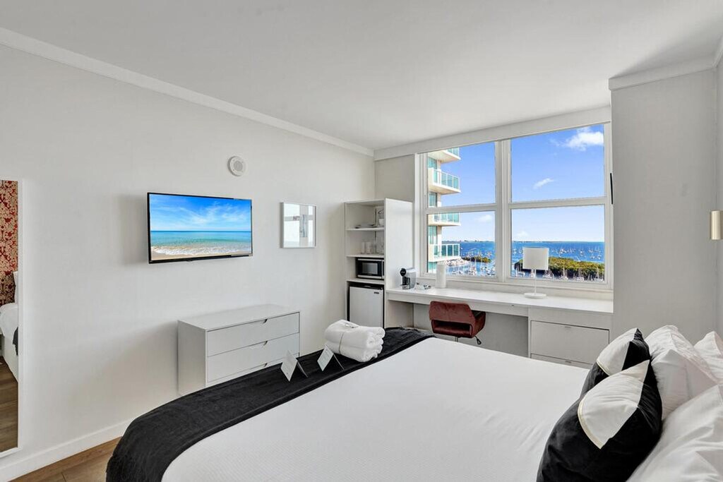 The advertised rate of $9,355/month is the lowest available price, based on a 30 day(s) stay with a move-in date of July 21, 2026. Rates vary depending on the duration of stay, season, and other parameters. For exact pricing and additional pricing components, please visit our website and enter your desired move-in and move-out dates. The rate is applicable when billed upfront; it can be higher if billed in multiple payments. Feel at home in this modern 14th-floor 2-bedroom apartment at The Arya Hotel, offering beautiful bay and city views. Ideally located in Coconut Grove, this inviting space blends comfort and convenience. This apartment combines two private studio units under one reservation, offering privacy with the ease of staying together. Each unit functions independently as its own bedroom and includes a bright layout with modern finishes, a kitchenette equipped with a fridge, microwave, and coffee maker, a Smart TV with streaming apps, high-speed Wi-Fi, a full bathroom with a shower/tub combo and hotel-quality towels, and central A/C and blackout curtains. Guests enjoy access to The Arya’s premium amenities, including an outdoor pool and hot tub on the 8th floor overlooking Biscayne Bay, a rooftop fitness center with skyline views and locker facilities, and a lobby lounge. One designated parking space is included with your stay. Laundry facilities are available on the 6th floor for self-service at $2.75 per load. An external laundry service offers same-day return, and the rate list is provided in your room. Walk to CocoWalk for dining, shopping, and nightlife. This apartment is minutes from Vizcaya Museum, Downtown Miami, and Brickell, and approximately a 20-minute drive to Miami Beach and MIA Airport. It is also surrounded by parks, art galleries, and the charm of Coconut Grove. The primary guest must be 21 years or older to check in and must present a valid ID at the front desk. No parties, gatherings, or events are allowed, and violations will result in a $500 fine and immediate removal without refund. Quiet hours are from 10:00 PM to 9:00 AM, and any noise complaint may result in a $500 fine and/or cancellation without refund. No indoor smoking is allowed (includes cigarettes, vaping, hookah, cigars, or cannabis). Outdoor smoking is permitted at least 10 feet from the building, with doors and windows closed, and violations will result in a $500 fine and may result in immediate cancellation without refund. Tampering with cameras or any connected devices will result in a $1,000 fine and may result in immediate cancellation without refund. Please note that the partner will place a $350 refundable authorization hold on a credit or debit card about 72 hours before arrival for security. If damages or policy violations occur, related charges may apply; otherwise, the hold is released after checkout and processed within 5-7 business days. [SI]
