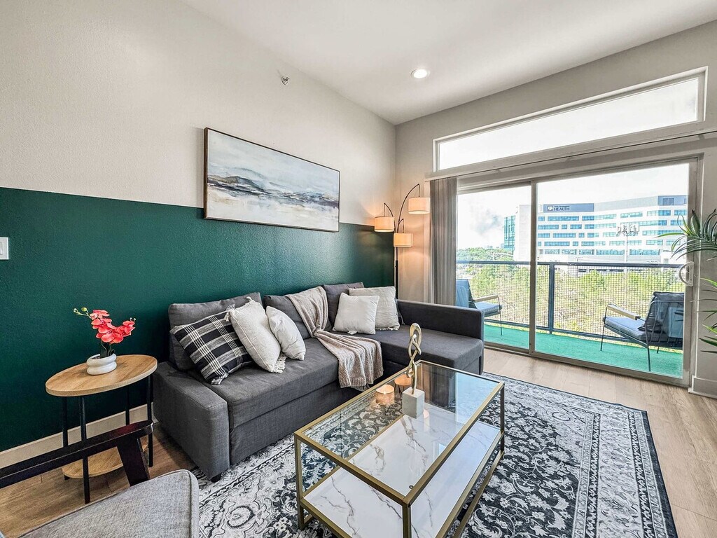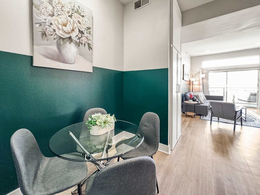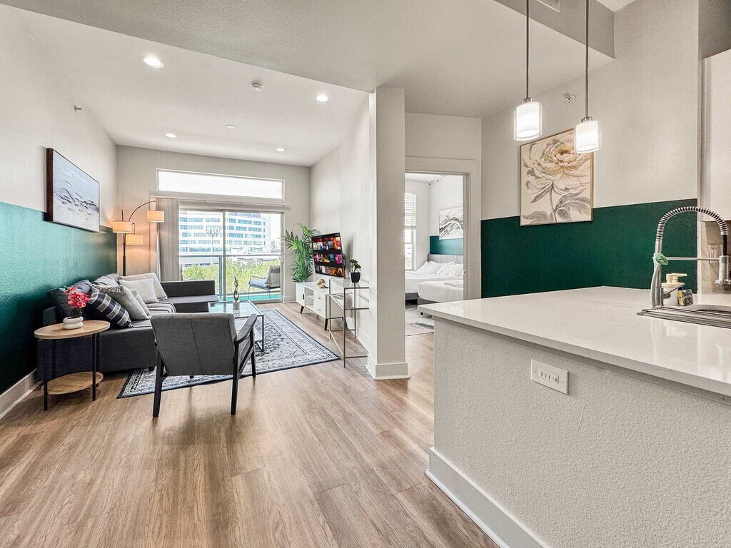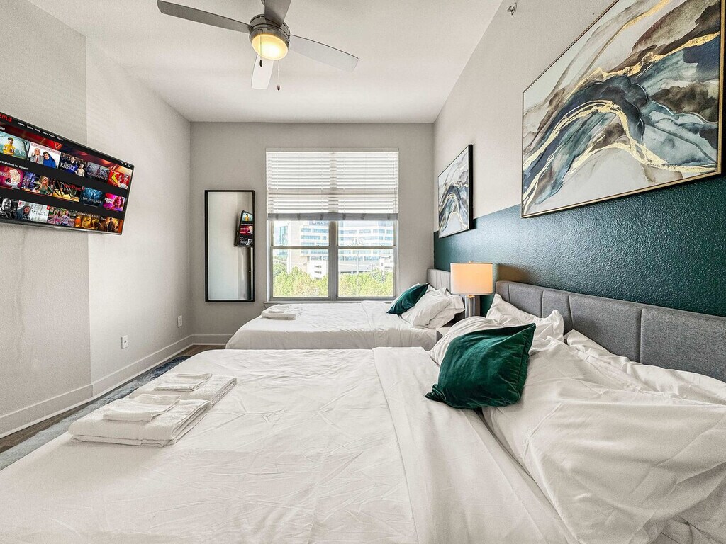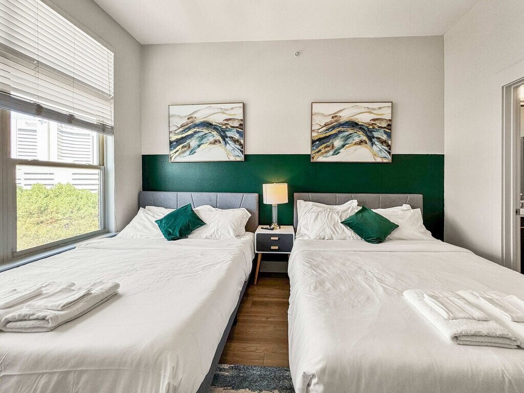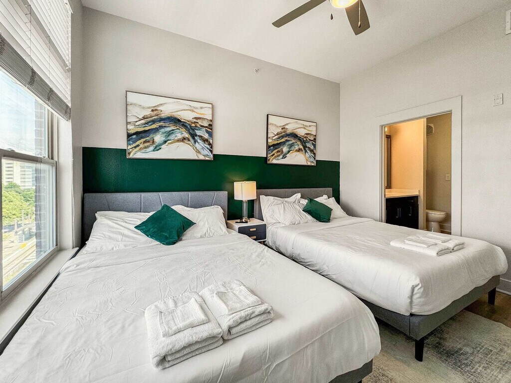 Enjoy the perfect Dallas stay in this modern and spotless 2-bedroom, 2-bath apartment with ultra-fast Wi-Fi. Rest in cozy beds, play tennis or pickleball, and explore nearby restaurants, parks, museums, and business hubs. Whether you're here for work or a longer visit, this apartment offers more charm and comfort than a hotel or standard rental. Feel at home in this cozy and modern apartment, perfect for a relaxing, stress-free stay. Enjoy an open living and dining area with LED lighting, contemporary furnishings, and large windows offering natural light and stunning night views. Warm wood floors add a touch of comfort and charm. The living room features a sofa bed, chair, coffee table, and a 60" 4K HDR Smart TV with Netflix. The kitchen is fully equipped with an oven, stove, fridge/freezer, dishwasher, Keurig coffee maker, water kettle, and all necessary glassware and silverware. Pets are allowed based on size, with an additional cleaning fee per pet: $25 per night for 1-4 nights, $200 for 5-29 nights, and $300 for 30+ nights. Please notify in advance to avoid cancellation. Explore the vibrant Dallas area with ease, as this apartment is conveniently located near a variety of restaurants, parks, museums, and business hubs. Whether you're in the mood for dining, outdoor activities, or cultural experiences, everything is within reach. Smoking is strictly prohibited inside the property, with a cleaning fee of $500 for any violation. Check-in time is after 4 PM, and check-out time is by 10 AM. Late check-outs without prior approval will incur additional charges. Please dispose of garbage in the designated bins to avoid attracting pests. Treat the property and its contents with respect, as any damages will be charged to the guest. No mail can be delivered to the property due to security concerns. For security, surveillance cameras are installed in hallways, and a Minut device is placed in the unit to monitor noise levels. Guest verification is required before your stay, including providing a valid government-issued ID and completing verification through our portal to receive check-in instructions. Verification must be completed within 24 hours of booking (1 hour for same-day bookings). Reservations that do not meet verification requirements may be canceled. The apartment is remote work-friendly with ultra-fast Wi-Fi, making it ideal for those who need to work from home during their stay. [SI]