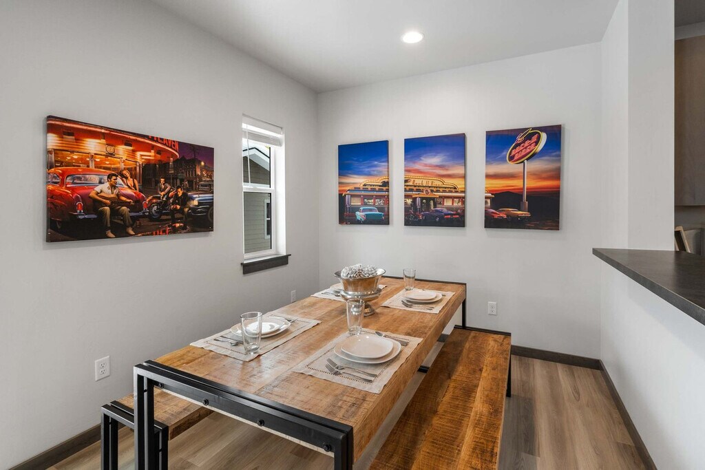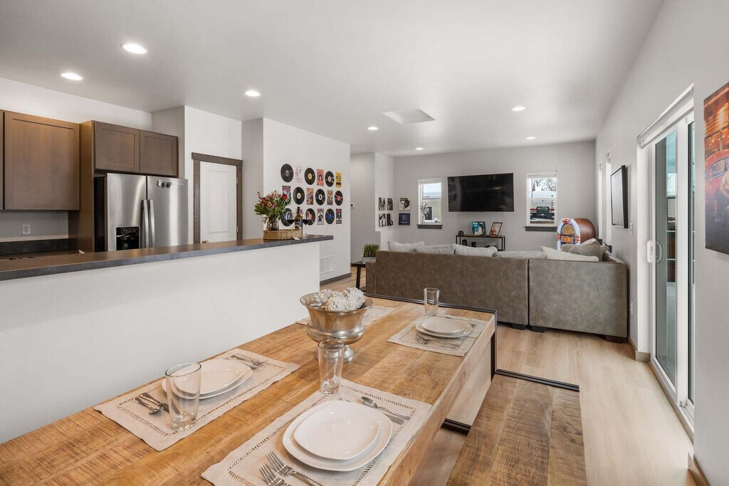Feel at home in the Jukebox Jet Away, a lavish 3-bedroom, 3-bathroom townhome nestled just a few blocks from downtown Bozeman. This impeccable townhome offers 3,000 square feet of living space and can comfortably accommodate up to eight guests. This home features a fully stocked kitchen, making meal times a breeze with a top-notch set of non-stick pots and pans and complementary cooking essentials. The light-filled dining room is open to the kitchen and features a table that can seat eight. The living room, adjacent to the dining area and kitchen, includes a luxury sofa, a 65” TV, and a jukebox with Bluetooth capabilities. Enjoy the outdoors on the back deck, which is located off the living room and has a gas grill. Entertainment options include foosball and air hockey. A rental car is available. Located just east of Main Street, this apartment is conveniently located near grocery stores and coffee shops. Bozeman’s Gallatin Field Airport is just a 10-mile drive away. Yellowstone National Park is located 80 miles away. During winter months, enjoy proximity to Bridger Bowl Ski Area and Crosscut Cross Country Ski Area, which are a mere 17-mile drive away. Big Sky resort is located just 45 miles away. Vehicles must be parked in the driveway; violators will be towed at the owner's expense. If additional parking is needed, street parking can be found on Michael Grove. Smoking is not allowed on the property. Registration Number: STR23-00057 [SI]