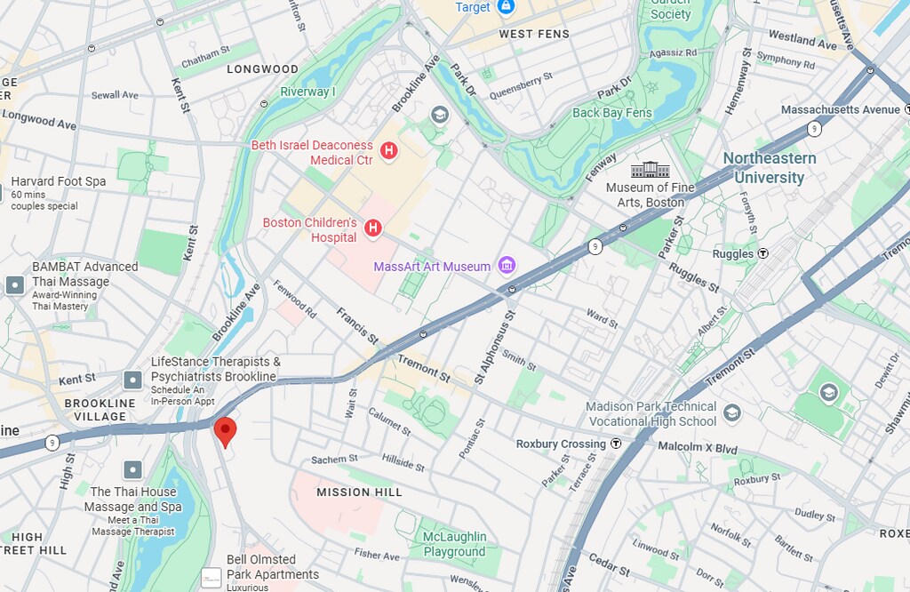 Está localizado en el barrio Mission Hill, 30 S Huntington Ave, Unit 1 en el código postal 02120 de Boston, MA.