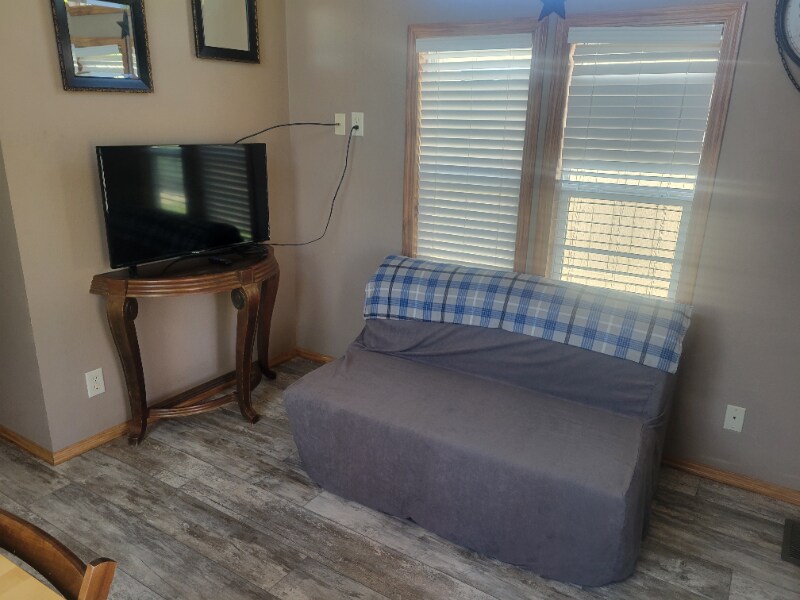 Property Id: 2223546 Cute and cozy. Full size Futon in Living Room, 2 Bunks in separate room and Queen bed in separate room. Does have washer/dryer hookups but does not currently have units in home. Does have access to Laundry facilities. COMPLETELY FURNISHED UNIT! Has porch with table and chairs and grill to use also. Rent by the night, weekly or monthly