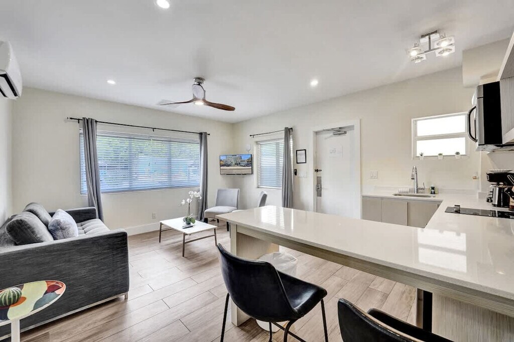 The advertised rate of $3,690/month is the lowest available price, based on a 30 day(s) stay with a move-in date of May 6, 2026. Rates vary depending on the duration of stay, season, and other parameters. For exact pricing and additional pricing components, please visit our website and enter your desired move-in and move-out dates. The rate is applicable when billed upfront; it can be higher if billed in multiple payments. Enjoy South Florida’s sunshine and clear waters! Feel at home in this stylish private apartment, steps from the beach and close to Las Olas Blvd, FLL airport, highways, great restaurants, nightlife, shopping, and cafés. It is the perfect centrally located spot for a relaxing and convenient Fort Lauderdale stay. This cozy retreat is designed with comfortable furnishings, comfortable beds, and a relaxed, welcoming vibe. Enjoy lush towels, premium linens, free Wi-Fi, a smart TV for streaming, and an updated exterior with a private deck. Take a dip in the brand-new plunge pool with a sunken lounge. There is also on-site laundry access. Parking is limited and available on a first-come, first-served basis for $30 per day. Payment is required prior to check-in. There is also a dedicated on-site office space plus vending machines with snacks and drinks. Perfectly located near Las Olas Blvd, top restaurants, nightlife, and FLL Airport, this apartment blends coastal charm with modern comfort. You’ll also enjoy being conveniently close to major attractions, approximately 15 minutes from Fort Lauderdale–Hollywood International Airport (FLL), approximately 10 minutes from Port Everglades (Cruise Port), and approximately 5 minutes to Las Olas Boulevard. No parties, gatherings, or events are allowed, and will result in a $500 fine and immediate removal without refund. Quiet hours are from 10:00 PM to 9:00 AM. Any noise complaint may result in a $500 fine and/or cancellation without refund. No indoor smoking is allowed (includes cigarettes, vaping, hookah, cigars, or cannabis). Outdoor smoking is permitted at least 10 feet from the building, with doors and windows closed, and a $500 fine will be assessed for any violation, which may result in immediate cancellation without refund. If you have a pet, it must be approved before booking, and the pet fee must be paid prior to receiving check-in instructions. Guests must send a photo of a valid ID that matches the reservation name via message before receiving check-in instructions. Guests must sign the rental agreement and check-in form before arrival. A $350 pre-authorization hold will be placed upon check-in to cover potential damages. Do not unplug, move, or tamper with cameras or any connected devices, and a $1,000 fine will be assessed for violations, which may result in immediate cancellation without refund. Includes dedicated on-site office space. Please note that the partner will place a $350 refundable authorization hold on a credit or debit card about 72 hours before arrival for security. If damages or policy violations occur, related charges may apply; otherwise, the hold is released after checkout and processed within 5-7 business days. [SI]