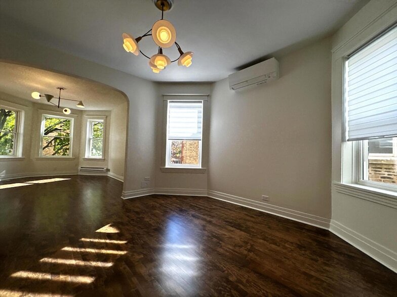 You don't want to miss your chance to live in one of the most vibrant parts of Chicago in this updated vintage 3-flat. Situated between Logan Square and Avondale, this 2-bedroom, 1-bathroom apartment sits on a quiet tree-lined street just a block from Milwaukee and Belmont. Inside, you will love the large, separated living and dining rooms, with brand-new custom fixtures and new pine hardwood floors [throughout]. Plenty of windows with new treatments allow sunlight to pour in from all directions throughout the day. The primary bedroom has both a wardrobe and a walk-in closet and is separated by the hallway from the second bedroom, perfect for an office or guest room. The full bathroom has been completely gutted and renovated. Step into the kitchen to find an area for dining, new quartz counter tops, and new appliances that have been cleverly selected to match the trends of the moment and the vintage vibe of this one-of-a-kind space. Don't sweat storage as there is a large-custom pantry off of the kitchen in back. And cool off with the [3] new Mitsubishi air conditioning units, as well as new/additional heating systems in the front and back of the home. Whether you are in the mood for Logan Square dining/entertainment within a 5-minute walk, reading on your enclosed porch/sunroom, OR relaxing/entertaining in the lush English garden with fire pit and gazebo, you have the convenience of all speeds with this property.