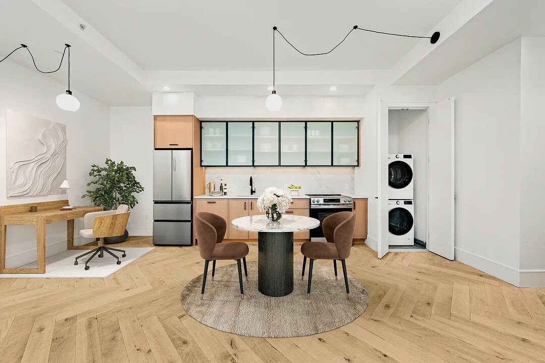 This one-bedroom residence features central heating and cooling, elegant herringbone wood flooring, a full-size in-unit washer and dryer, and thoughtfully designed interiors throughout. The custom kitchen is equipped with a premium stainless-steel appliance package, marble counters, and bespoke cabinetry, complemented by a refined bathroom with spa-like finishes. A private terrace extends the living space outdoors.Introducing 313 GRAMERCY, a beautifully reimagined rental residence where Gramercys storied elegance meets the vibrancy of modern Manhattan. Newly restored in 2026, this boutique building was designed for those who value effortless access to the citys most iconic neighborhoods. Envisioned by Kao-Hwa Lee Architects with interiors by Jessica Levine Interiors, the 13-story property offers 87 impeccably curated homes, framed by a paneled faade, full-height windows, and clean architectural lines that create an unmistakably sophisticated presence.Daily living is seamless at 313 GRAMERCY, with a virtual doorman, secure entry, dedicated package room, and attentive on-site management. Select residences are further elevated with private outdoor spaces, offering rare moments of calm above the city.Wellness is at the forefront of 313 GRAMERCY, with a fully equipped fitness center, spa, sauna, steam room, meditation room, and yoga and dance studio. Productivity is supported by a business center, coworking lounge with private phone booths, conference rooms, and an efficient package receiving system. Moments of relaxation and connection await in the resident lounge, movie theater, and recreation room, while pet owners enjoy access to a pet spa and dog washing station. The expansive roof deck, complete with BBQ grills, a prep kitchen, and landscaped green spaces, offers a serene retreat with sweeping open-air views. Additional conveniences include bike storage, a laundry room, security cameras, and doorstep recycling collection.Perfectly positioned in the heart of Gramercy Park, 313 GRAMERCY sits beside the charming Stuyvesant Square Park and enjoys the tranquility of tree-lined streets paired with proximity to Union Square transit, celebrated restaurants, and everyday conveniences. The location is ideally located near NYU, Parsons, SVA, The New School, and Baruch College, placing the very best of New York within easy reach.