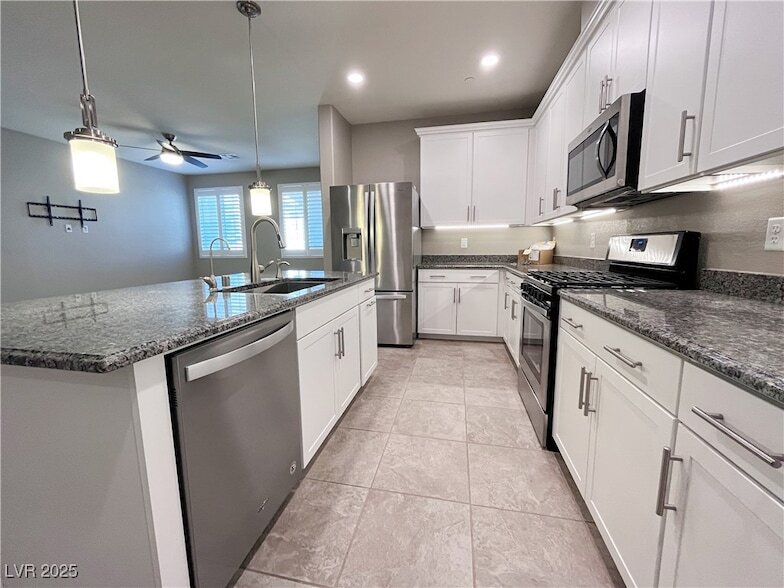 This modern two-story offers a spacious open layout with a large kitchen island, stainless steel appliances, and plenty of cabinet storage. Enjoy upgraded shutters throughout, stylish two-tone paint, and a mix of tile and plush carpet flooring. Every room features upgraded ceiling fans, and the home includes a water softener for added comfort. A 2-car garage rounds out this move-in-ready property in one of Henderson s most desirable communities of Inspirada: community Pools, Parks, and amenities.