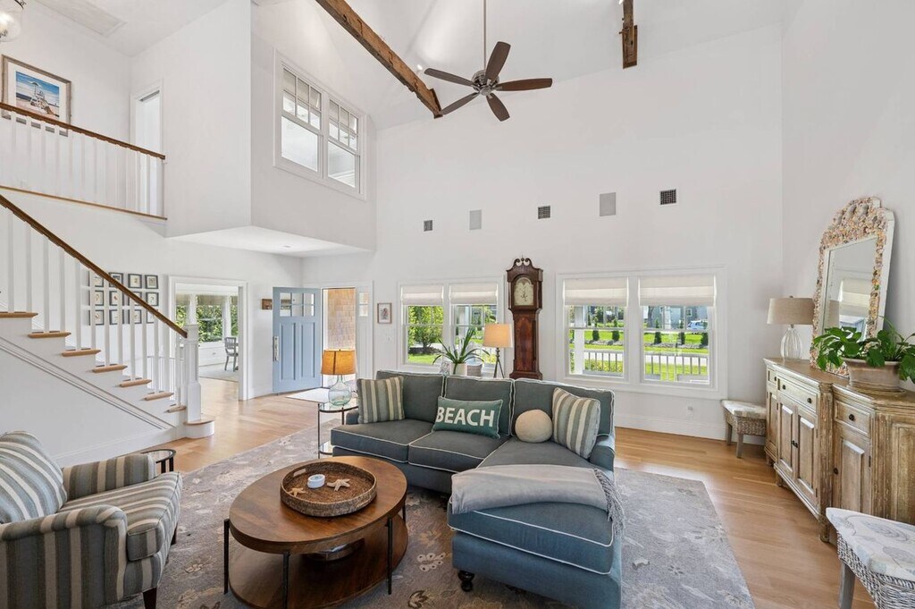The perfect Southampton summer rental that features water access, water views, a heated pool and a front porch facing the harbor. Open two-story living room with stone fireplace, a well equipped kitchen with all marble top counters and stainless Viking appliances and a first floor primary bedroom with King bed, marble primary bath and a second floor gym. Upstairs are three additional en-suite bedrooms. French doors open to the pool area with a heated pool with waterfall and outdoor shower to wash off the sand before diving into the pool! [[Rental Registration # RP240659]]