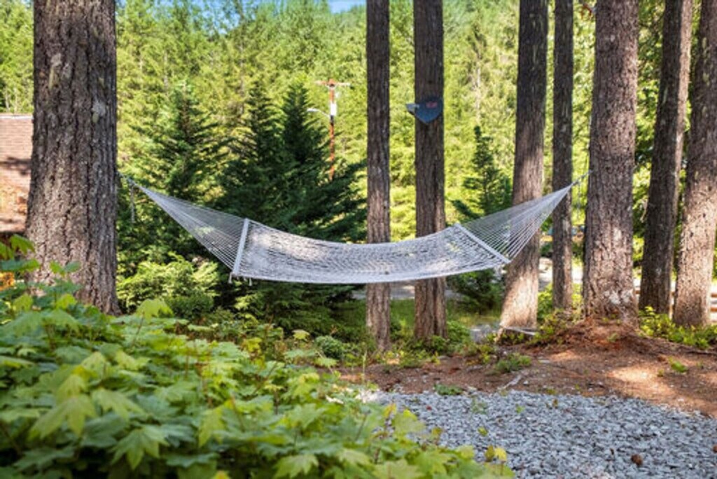 Feel at home in this serene and private cabin near Mt. Rainier! This two-story home has 2-bedrooms, 1 bathroom and is around 816 sq ft with a few steps to the entrance door. Relax around the stone fire pit, gather around the picnic table for a cookout, or soak in the bubbling hot tub; all areas are covered for you to enjoy them rain or shine. The community area includes a lake for fishing/swimming, a picnic area, a community building, and walking trails. The home also features a smart TV, internet for streaming, high-quality bed, mattress, pillows and linens for comfortable sleeping, and a fully stocked kitchen for all your cooking needs. An on-site washer and dryer are available for all your laundry needs. All outdoor activities are under covered spaces including picnic table, fire pit and hot tub. Pets are welcome with a fee of $50 per pet per night, which has already been included in your invoice if you selected pets on your reservation. Strictly no parties and events are allowed, and quiet hours are between 10pm-8am. There is no smoking or vaping of any kind allowed anywhere on the property, including outdoor areas, and no digital piracy or shoes in the home. A $500 fine will be imposed per violation. If you bring a pet, kindly refrain from allowing pets on furniture/linens including couches, throws, beds, pillows, and towels. Please do not leave pets unattended and bring poop bags to pick up after your pets. Use of the fire pit and charcoal grill are prohibited during the burn ban. The regular nightly rate covers 4 guests. Additional guest fees are $25 per person per night, up to a maximum of 5 guests. Please indicate an accurate number of guests. [SI]