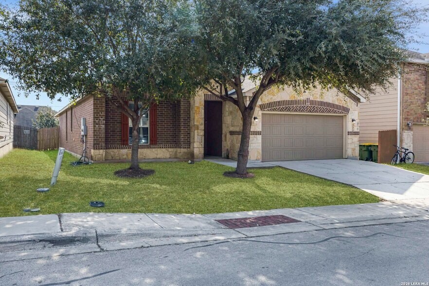 Nicely maintained 3-bedroom, 2-bath, 2 car garage home featuring a spacious and functional open floor plan with 9' ceilings throughout. Upon entry, you'll find a large study/home office-perfect for remote work or flex space. The kitchen is designed for both style and convenience, offering 42" cabinets, granite countertops, a center island, and ample storage, all flowing seamlessly into the living area with tile flooring. The private primary suite includes a well-appointed bathroom with double vanities, a separate soaking tub, and a walk-in shower. Refrigerator is included for added convenience. Ideally located with easy access to Interstate 35 and Loop 1604, and just a short 15-minute drive to Randolph AFB. Enjoy close proximity to shopping centers, dining, and everyday essentials. Move-in ready and perfectly situated for comfort and convenience.