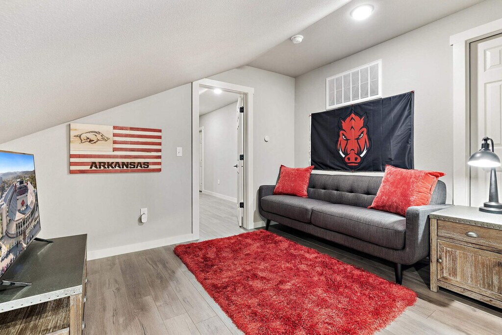 Feel at home in this luxurious East Fayetteville home, tucked away in a quiet, family-friendly neighborhood. This spacious home accommodates 8 guests with 4 private bedrooms and 3 bathrooms. The home features 2 living spaces and a huge, fully stocked modern kitchen with high-end appliances and a four-top dining table. Enjoy the cozy living room with a plush sectional, two lounge chairs, a 65-inch Smart TV, and a working fireplace. There is also a second living room on the second floor, complete with a sofa and 35-inch Smart TV. Step outside to the fenced-in yard with a patio and BBQ grill. A 2-car garage is available for guest use, as well as a washer and dryer. Located in mid-town Fayetteville, this home is 0.9 miles from the Razorback Greenway bike trails, 1.5 miles from Paradise Valley Golf Course, 2 miles from Gully Park, 5 miles from Downtown Fayetteville and the University of Arkansas, and 3 miles to the Northwest Arkansas Mall and several other dining and shopping options. The home is close to public transit and with access to rideshare/taxi. Check-in is any time after 3:00 PM. Parties or guest actions that result in disturbances, property damage, extensive extra cleaning, or smoking indoors will incur a fine of $1,000. Pets are not allowed at the property; pets discovered at the property will incur a fine of $400. Unauthorized checkout delays will incur a fine of $100 per hour. Quiet hours are between 10:00 PM and 10:00 AM. Includes an office space with a desk and chair. Registration Number: STR- [SI]