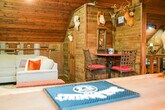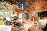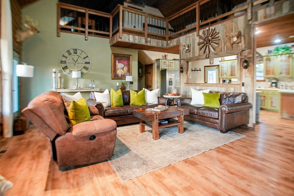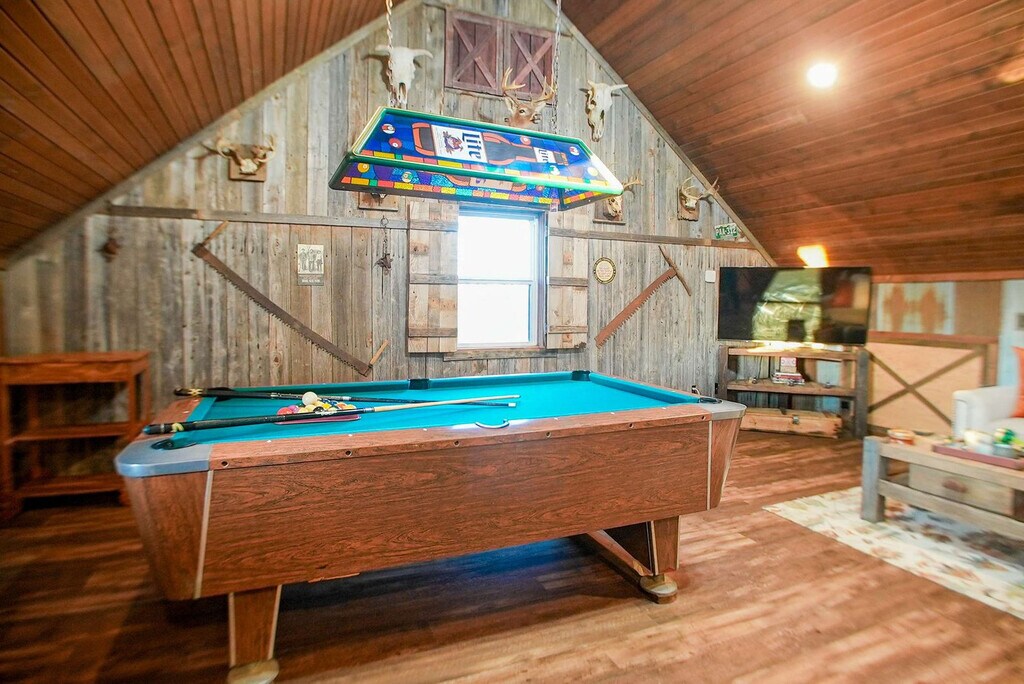 Feel at home in this secluded hilltop haven, a 2-bedroom plus loft cabin offering a perfect country escape. Nestled on a peaceful hilltop, this property blends rustic charm with modern comforts and offers endless entertainment indoors and out. This property features vaulted ceilings, warm wood accents, and a stone fireplace. There is a spacious living room and dining area, along with a fully equipped kitchen with modern appliances and an island. Enjoy the wraparound deck with dining area and seating, a fire pit, a propane grill, and panoramic views. A private seasonal pool and year-round hot tub are available for your enjoyment. For entertainment, there is a game loft with foosball and pool tables, a smart TV, and a lounge area, plus high-speed Wi-Fi and streaming apps. Up to 3 vehicles can park on-site; please avoid parking on the grass. Nestled in a tranquil and secluded area just 15 minutes from Fayetteville, this hilltop retreat offers the perfect blend of privacy and convenience. Surrounded by rolling hills and scenic countryside, it’s a peaceful escape from everyday life. It's also located 15 minutes to the University of Arkansas and Downtown Fayetteville for restaurants, shops, and cultural attractions. Explore nearby hiking and biking trails, the Crystal Bridges Museum, and the natural beauty of the Ozarks. Having a car is recommended to reach the property and explore the area. Quiet hours are from 9 pm to 8 am; please respect neighbors and the tranquil setting. Smoking and vaping are only allowed outside, and waste must be disposed of responsibly. Up to 2 well-behaved dogs are allowed, but no cats. Bring your own pet supplies, and crate dogs when left alone. Exterior cameras monitor the driveway and deck for safety; there are no cameras inside. There are multiple steps and uneven terrain, which may not suit guests with mobility limitations. Expect wildlife, insects, and rural road noise. The pool is seasonal and open April through September. Use at your own risk, and children must be supervised. Parties or events are not permitted without prior approval. [SI]