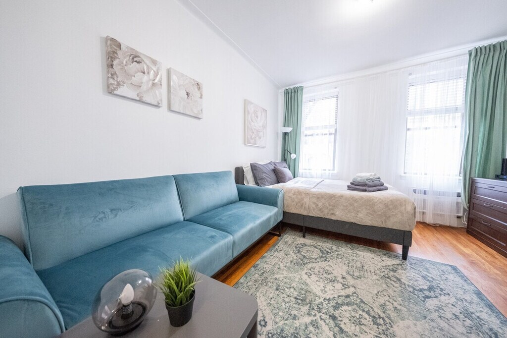 Feel at home in this centrally located, stylish, and fully furnished studio apartment situated on the second floor of a walk-up building, just two flights up. The apartment offers all necessary amenities for a comfortable stay, including Wi-Fi and all utilities such as heat, hot water, and gas/electricity. The apartment is fully furnished and features a fully equipped kitchen with a large refrigerator, stovetop, oven, NESPRESSO coffee machine, toaster, microwave, and all the utensils and cutlery you might need. Enjoy a good-sized marble bathroom with both a shower and a bathtub. The living space includes a queen-size bed, sofa, desk, mirror, and AC, with an air mattress available. Laundry facilities are conveniently located in the basement. Parking is available on the street and is free. However, alternate side parking is in effect most days, so be sure to read all signs to avoid tickets. Located in the Upper East Side, this apartment is a stone's throw away from the Q train line at 72nd Street and the 6 train line at 77th Street, making it easy to explore the city. The neighborhood is known for its posh buildings, flagship boutiques on Madison Avenue, and proximity to some of the most fantastic museums in the country. With plenty of restaurants right on the corner and a City Bike station just 200 meters away, you'll have everything you need at your fingertips. The apartment is strictly non-smoking, and smoking inside or outside will result in a $500 fine. Pets are not allowed, and luggage storage is not available on-site. Quiet hours are from 10 pm to 7 am, and the apartment must be used for vacation purposes only, with no commercial use allowed. Check-out time is 11:00 AM, and all dishes should be placed in the kitchen sink, with all trash in the trashcans. A laptop computer is not included. Children should be noted that the apartment is not child-proof or child-protected. Kindly note that a $350 refundable security deposit is required and will be collected directly by the partner after your booking is confirmed. The security deposit will be handled through direct communication with the partner and is not processed automatically. [SI]