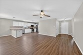 Open concept floor-plan and huge living room. Freshly painted and the replaced carpet int the bedrooms. Beautiful wood-tone laminate flooring in entry, kitchen and dining. The kitchen boasts a stone backsplash, new stainless steel dishwasher, electric range and new microwave. The master suite is split for privacy and offers a ceiling fan, large walk-in closet, tile flooring in the bath, ample vanity space, open shelving and over-sized walk-in shower. One of the secondary bedrooms could be a second master bedroom and both bedrooms have ample closet space. Outside you will find a large 11 x 10 previously screened in patio, Board on Board fence and plenty of room for play! Backs to trees and greenspace.