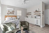 Welcome to this bright and modern guest suite, your private ADU retreat in the heart of Durham. Designed for both short-term getaways and long-term stays, this cozy upper-level space offers comfort, convenience, and just the right amount of personality. Located above a private garage, you’ll have the entire unit to yourself, including a desk for remote work, a light kitchen set-up for simple meals, and a Smart TV for winding down. This apartment features a private garage and an additional parking pad. Enjoy a cozy living space with a Smart TV and desk, a light kitchen set-up with a cooktop, mini-fridge, microwave, and coffee maker, and a washer and dryer in the garage for extended stays. Stylish open shelving and thoughtful touches are found throughout. We welcome one small to medium-sized dog, but no cats, please. Pets must be leashed outdoors and waste properly disposed of. A $50 fee will be charged if cleaners must pick up after pets. Be sure to send pet information at the time of your booking request. Situated in a quiet residential area, this apartment is just a short drive to downtown Durham, only 10 minutes to attractions like DPAC and the Durham Bulls Stadium, and 12 minutes to Duke University. Coffee shops and essentials are just 5 minutes away, making this walkable neighborhood perfect for experiencing the local vibe. This property is professionally managed to ensure a seamless guest experience from start to finish. Guests will have access to 24/7 guest messaging support for questions, recommendations, or troubleshooting, a dedicated emergency line for urgent issues, and local insights and digital guidebooks to help you make the most of your time in Durham. While the team won’t be on-site, they are always just a message away and happy to assist throughout your visit. Includes a desk for remote work, ensuring a comfortable and productive stay. A laptop computer is not included. [SI]