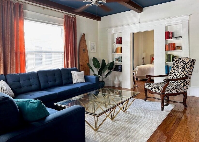 Welcome to this charming 2-bedroom, 2-bath ground-floor apartment in a classic St. Pete bungalow featuring a private entrance, spacious front porch, and on-site parking for 1 2 vehicles. Inside, the home blends vintage character with modern comforts, offering a main living area with a comfortable sectional sofa, smart TV, dining space for four, and built-in shelving with a curated selection of books. The kitchen includes granite countertops and essential appliances such as a refrigerator, stove/oven, microwave, and coffee maker, along with a dish rack and cleaning supplies. The first bedroom features a king bed, seating area, and closet, plus an intimate private bathroom with a stall shower. The second bedroom includes a queen bed, dresser, and additional seating, with an adjacent bonus room offering a twin daybed, washer, dryer, and extra closet space. A centrally located second bathroom includes a tub/shower combo. This unit is part of an older building in a lively St. Pete area and is situated beneath another occupied apartment; for added comfort, both bedrooms include noise machines. This thoughtfully furnished residence offers convenience, charm, and a flexible layout suited for a variety of needs.