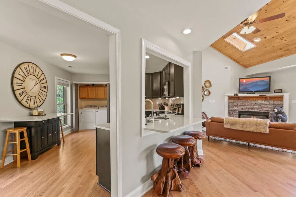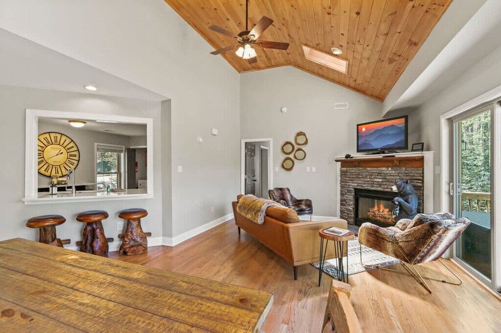 Welcome to this gorgeous newly renovated home in Beech Mountain, perfect for a large family getaway. This two-story cabin offers a spacious open-plan living area with modern amenities, two living areas, and a game room for entertainment. With four comfortable bedrooms, each with private bathrooms, and stunning mountain views from multiple decks, you'll feel at home in this beautiful setting. Step into this fairy tale cabin where immaculate open space meets modern comfort. The cozy open-plan living area is designed with numerous modern amenities, including a fully equipped kitchen and an inviting dining area that opens onto an attractive living room. Upstairs, the living room features comfy couches, a cozy fireplace, and access to the outdoor deck. Downstairs, enjoy a gaming area with shuffleboard and air hockey. The kitchen is a chef's dream, complete with a microwave, stove, oven, refrigerator/freezer, coffee maker, dishwasher, and all necessary cookware and utensils. The large dining area is perfect for home-cooked meals, with seating for up to 11 guests. Beech Mountain Club access is available for a $300 transfer fee. Bring your fur baby with you, limited to one dog under 50 lbs with a $150 pet fee. Early check-in and late check-out are subject to availability with a $25 per hour fee. The cabin is situated in the small vacation town of Beech Mountain, NC, offering a remote location with small-town charm. Enjoy nearby woodsy trails and a short drive to Lake Coffey for additional trails. The area provides plenty of attractions, including skiing, snowboarding, snow tubing, zip-lining, mountain biking, off-road ATVs, rafting, fly fishing, hiking, golf, fine dining, and shopping. Both Beech Mountain and Banner Elk offer these activities at your fingertips. Smoking is not allowed on the property. There is a security camera on the front door and in the driveway. Pets are not allowed. People other than those in the guest's party designated in the reservation may not stay overnight at the property. Keep the property and all furnishings in good order and only use appliances for their intended uses. There is no daily housekeeping service, and while linens are included, daily maid service is not included in the rental rate.