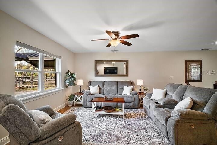 Welcome to Dora Ridge Ranch! This stunning, spacious, and fully furnished home can become your dream rental with flexible leasing terms. Arriving to the property you will notice the large fenced in yard, covered parking, and lovely entryway. The living area is bright and open including an electric fireplace. The kitchen has stylish two toned cabinetry with tons of storage space, stainless steel appliances, and generous sized island with seating. The primary bedroom has en suite bathroom with custom walk in shower. Second and third bedrooms share the hall bath that also features custom tile that really pops! Laundry room is located inside where you will find more storage and large utility sink. Enjoy outdoor dining or relaxing on the fully screen back porch that has a very private setting. Water, electric, Wifi, and lawn care are all included in the monthly rent. Call today for your private tour!