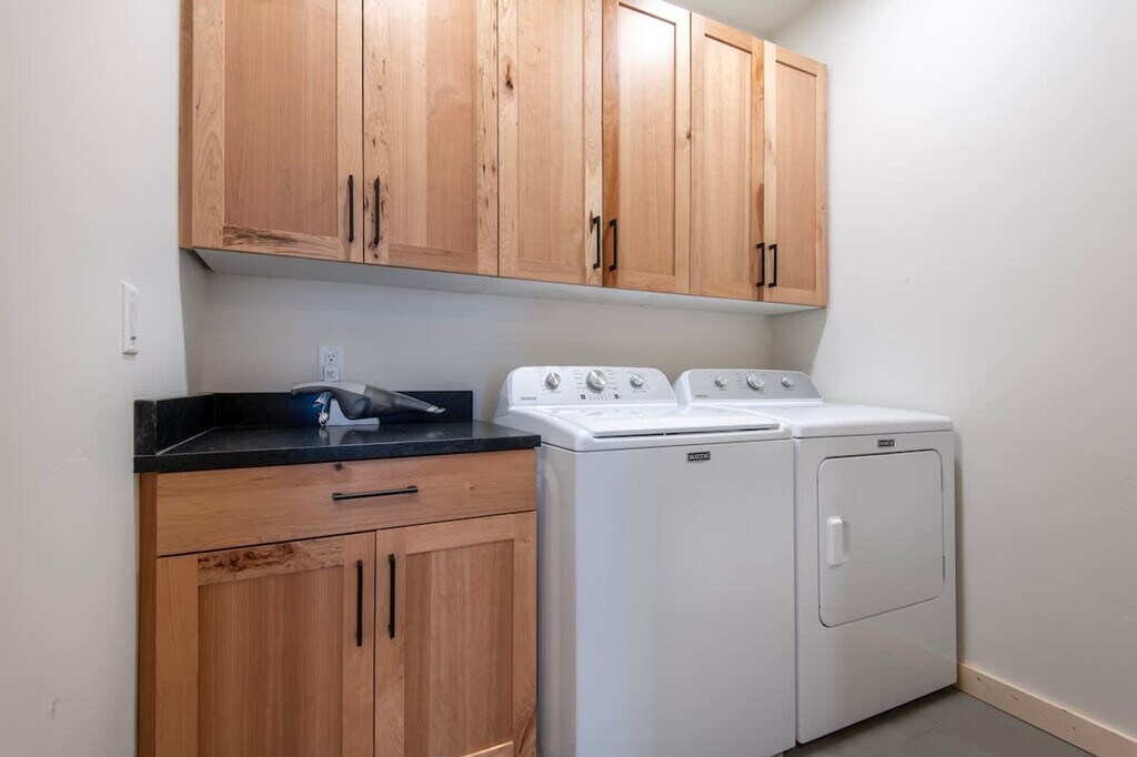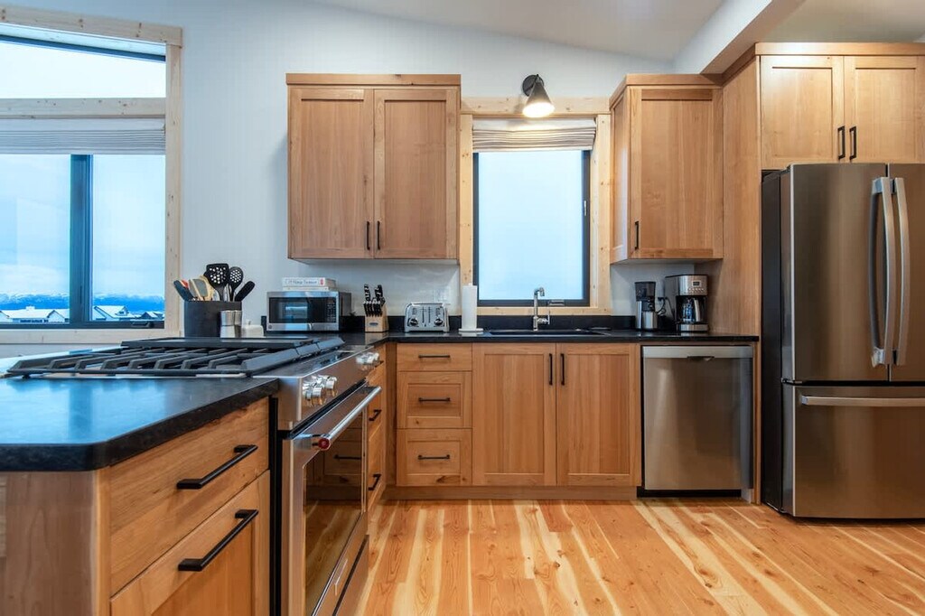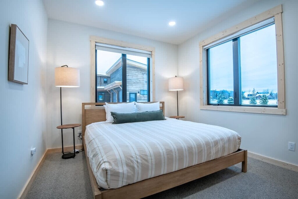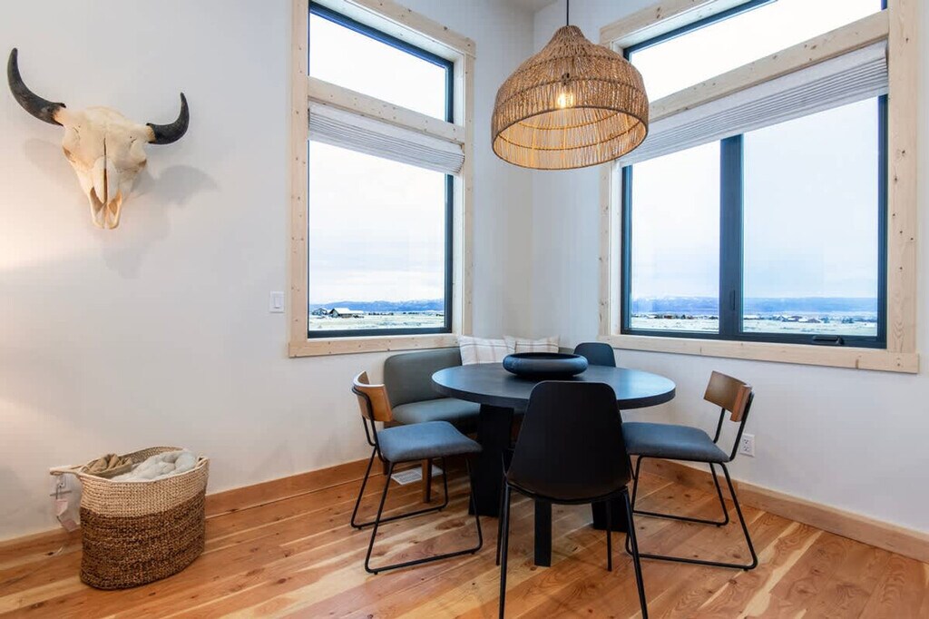 Nestled at the base of the Teton Mountains, this modern guest house offers a stylish and cozy retreat with breathtaking Teton views. Designed for comfort and convenience, it provides the perfect home base for skiing, hiking, or simply unwinding in nature, all while being ideally located just north of Driggs. This inviting space combines comfort with style, featuring a king bedroom and a bunk room with twin and queen beds, making it perfect for families, couples, or friends. The spacious living room boasts a cozy propane fireplace, a large smart TV, and floor-to-ceiling windows showcasing stunning Teton views. The fully equipped kitchen has everything you need to cook meals, plus bar seating for four and a dining area with bench seating. For those who need to stay connected, there's a dedicated office space in the bunk room. A full washer and dryer are available in the laundry room for your convenience, and the expansive deck offers elevated Teton views, perfect for morning coffee or an evening unwind. The property features two homes, primarily renting out the main home. However, the main home and guest home can be rented as one rental for larger groups needing more space. Stay close to everything Teton Valley has to offer. Enjoy summer adventures like Teton River floats and fishing just minutes away, world-class mountain biking and hiking on stunning Teton Valley trails, and scenic chairlifts, hiking, and summer concerts at Grand Targhee Resort, only 15 minutes away. Downtown Driggs offers great restaurants, breweries, and boutique shopping. In winter, experience legendary deep powder and a laid-back atmosphere at Grand Targhee Resort, just 15 minutes away, or explore some of the best skiing and snowboarding in the country at Jackson Hole and Teton Pass. Snowmobiling and Nordic skiing offer endless backcountry access right from your doorstep. The property has important house rules to ensure a safe and enjoyable stay. Quiet hours are from 9 pm to 8 am, and no events, parties, or large gatherings are allowed. Smoking or vaping in the home or on the decks is prohibited, with an additional charge applied if any butts are found on the property. Exterior lights should be turned off at night to preserve the dark skies. A maximum of two licensed vehicles is allowed in the driveway and garages. Riding snow machines, dirt bikes, or ATVs in the subdivision or at the rental property is not permitted, and no fireworks are allowed on the premises. All main entry doors should be locked when not occupied. Fines will apply for violations, including smoking in the house or garage, failure to follow house rules, and mistreatment of the hot tub, with a minimum $500 fine for smoking/vaping/marijuana in the house or garage, violation of house rules, posted signs, laws, or failure to vacate at check-out time. The apartment is remote work-friendly with a dedicated office space in the bunk room, ensuring you can stay connected during your stay.