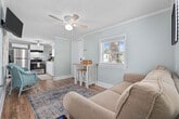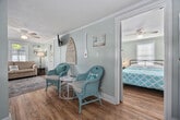 If you are seeking peace, privacy, and serenity close to the ocean with modern upgrades, this beautifully decorated 2-bedroom, 1-bathroom cottage is the perfect choice. Located on the front half of the property, it can be rented alone or with a more spacious 3-bedroom, 2-bathroom home on the back half, allowing the whole family to come together while still having their own separate spaces. Situated just 4 blocks from the public beach access at the end of Seabreeze Drive in Garden City Beach, you'll enjoy proximity to the beach without the crowds and noise of nearby resorts. This family retreat offers fantastic outdoor dining and entertaining spaces and plenty of on-site free parking. Step inside to a bright, welcoming interior filled with natural light and a cozy atmosphere. The living area is styled with contemporary finishings, creating the perfect spot to relax after a day at the beach. The kitchen is well equipped with stainless steel appliances and ample cabinet space, making it easy to prepare everything from family meals to beach-day snacks. This home offers two comfortable bedrooms, one with a queen bed and the other with a double bed, both designed to ensure a restful night's sleep. The rooms connect to a convenient Jack-and-Jill style bathroom, providing comfort and privacy. Outside, enjoy a fully fenced yard ideal for your furry friends (with host approval) and fire up the charcoal grill for a relaxed evening at home. One dog under 35 lbs is permitted with a $150 pet cleaning fee. We provide linens for all beds in the home as well as bath towels, hand towels, bath mats, and washcloths for your stay. Additionally, there will be a roll of paper towels in the kitchen, 2 rolls of toilet paper per bathroom, hand and dish soaps, and 2 laundry pods and 2 dish pods, all included with the cleaning fee. You will want to bring pool or beach towels for your stay. We also have some fun beach gear at the home that you are welcome to use during your stay. Located just 4 blocks from the public beach access off Seabreeze Drive in Garden City Beach, you will be close to shopping with grocery stores, coffee shops, delicious restaurants, a surf shop, and more. Renting one of our 4 or 6-seater golf carts is highly recommended for your stay as they are the perfect way to get around Garden City, and you will find beach parking much easier than with your car. We provide the gas for the rental, and there is an onboard sound bar so you can play all your favorite tunes while cruising. The property is non-smoking, and there is a quiet time between 11:00 PM and 7:00 AM. Check-in is from 4:00 PM to 10:00 PM, and check-out is at 10:00 AM. By state law, occupancy may not exceed 4, including infants and children. There is a minimum age requirement of 25 for renters. [SI]