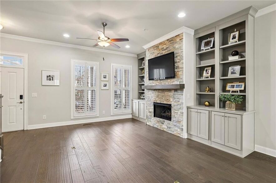 THE BEST LOCATION IN WALKABLE DOWNTOWN ALPHARETTA. Nestled Behind the Green Space on Alpharetta s prettiest tree lined streets with Double Balconies in the heart of Downtown Alpharetta's City Center and Avalon!!. This amazing 3 bedroom townhome has a spacious open floorplan with natural Stone detail around fireplace, hardwood floors, 10'ceilings in the living and kitchen areas and a sunroom great for an office. Kitchen has an abundance of cabinets with soft close doors/drawers, Stainless Steel Appliances, Large island, custom pantry and quartz counters. Large master suite with custom Brick accent wall, balcony for morning coffee, walk in custom closet and an enormous walk in shower with 3 shower heads. ELEVATOR READY! All Closets are custom fitted. as an added bonus the home has ceiling mounted SONOS speakers! Beautifully appointed with Great Space and desirable features making this the perfect move in ready home for empty nesters or downsizers looking for life in the Stroll Zone of all the shops and restaurants downtown Alpharetta has to offer. Ready for Move in!
