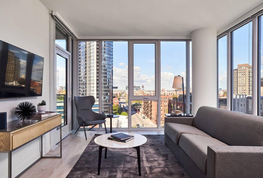 Feel at home in this sophisticated River North apartment. Available for nightly and extended stays, this apartment boasts modern design and access to unparalleled lifestyle amenities. This executive suite offers a fully equipped gourmet kitchen and floor-to-ceiling windows with remarkable city views from the private balcony. Relax on modern designed furniture and enjoy access to over 30,000 sq ft of unrivaled lifestyle amenities including a rooftop pool with cabanas, outdoor bocce court, fitness center, dog run, and co-working space. The Hypnos® mattress is carefully selected and strategically paired with high thread-count linens, hypoallergenic duvet, and pillows. Includes in-suite laundry, high-speed Wi-Fi, a flat-screen smart TV with cable, air conditioning, an in-suite workspace, and a deep soaking tub or walk-in shower. On-site self-parking is available for an additional fee. Pets are welcome with a $150 one-time fee and a $5 daily fee for each pet. River North is the go-to district for art and design lovers, bursting with energy, fabulous art galleries, and history-defining buildings. The best shopping in Chicago is minutes away at The Magnificent Mile, the Loop business district is just across the river, and plenty of fresh air and green space can be found riverside. The area is home to many significant architectural standouts, including the Merchandise Mart. No parties are allowed. Includes co-working offices and conference rooms, complete with audio-visual equipment. All guests have access to over 30,000 sq ft of breathtaking indoor and outdoor amenities exclusive to residents and guests, including elegant outdoor seating areas, contemporary outdoor fire pits, dedicated grill stations, an inviting outdoor heated pool and hot tub, poolside cabanas, chaise lounges and daybeds, a convenient pet spa and outdoor pet park, a professionally equipped fitness center featuring treadmills, rowing machines, spin bikes, weigh racks and much more, a spacious steam room and dry sauna, an inviting media room and multiple themed lounges, perfect for different occasions, convenient co-working offices and conference rooms, complete with audio-visual equipment, and an arcade with pinball machines, skeeball and a large-screen TV for gaming and small gatherings with friends. Full amenity access cannot be guaranteed due to temporary closures. Contact the trusted partner to inquire about additional housekeeping services during your stay. [SI]